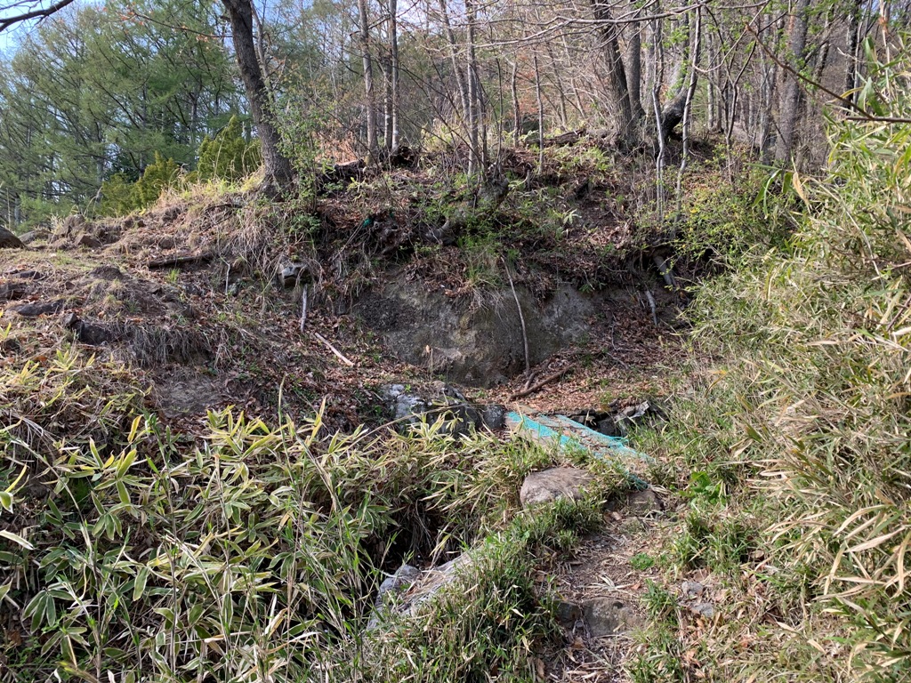 城から大見山に通ずる尾根600m奥の岩山にも二筋のV字型の堀を設けて、尾根を遮断してあります。この堀は「諏訪藩主手元絵図」にある大城がこれにあたり、これはつまり大和城の避難場所と推定されます。(案内板転記)