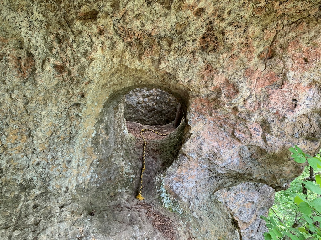 弘法山まで約300mの道標を左に折れる。そこから急な坂道となり、山頂直下は大岩の連続となる。大岩はくり貫かれ観音世菩薩像が安置されている。急な石段、弘法の眼を抜けると展望台があり、その上が弘法山(842m)山頂だ。そこから塩田平が一望出来る。観音世菩薩像は33体あるようで、反対側に少し下ると十五番と十六番があった。➠ Map