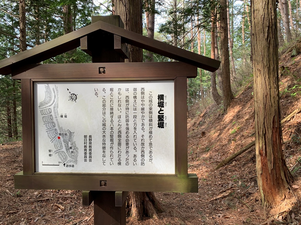 国道19号から朝日村役場を目指す。途中西洗馬公民館の先を左折して、400m程行くと武居城公園がある。そこに駐車場があり、公園の奥に武居城跡入口がある。