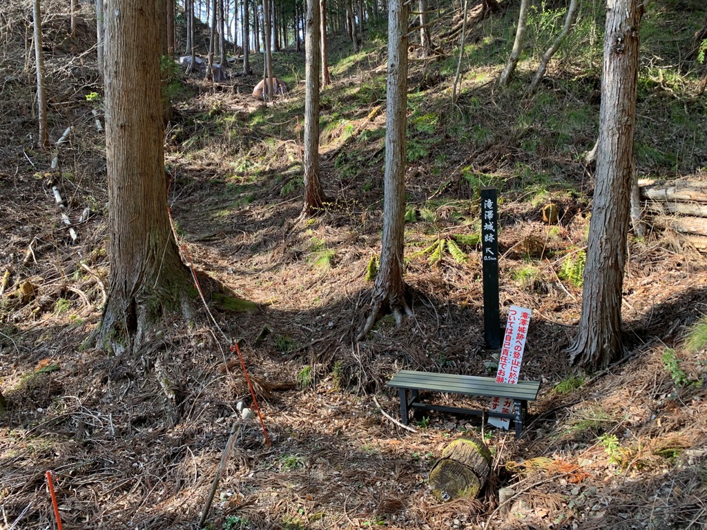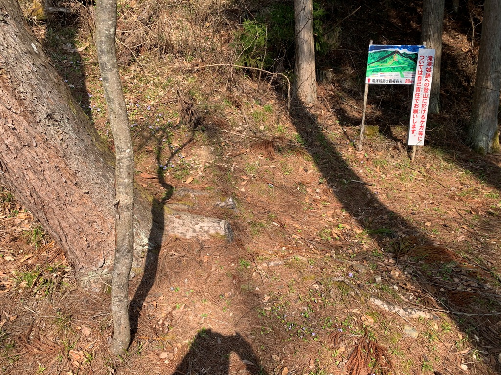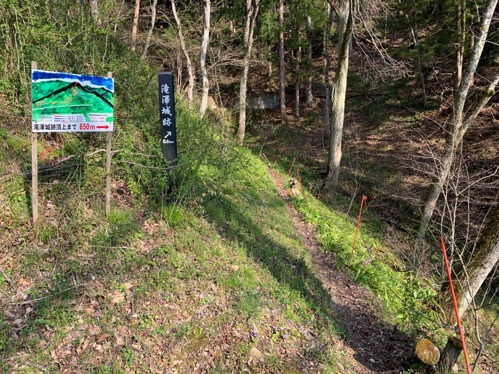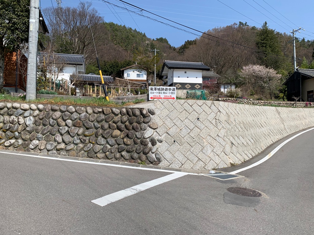 県道51号滝沢信号を1.1km程田ノ入峠方向に進むと、滝澤城遊歩道案内の道標がある。近くに駐車場があったので留める。