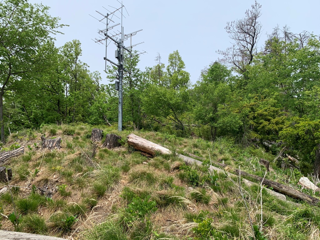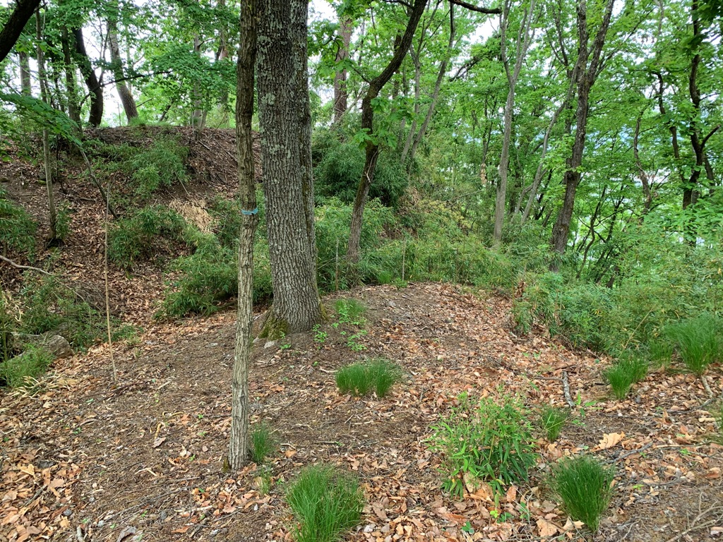 その一角の上り口に入ると、直ぐに長い階段がある。階段を上りきると、滑り易い砂利状の道になるが、暫く進むと堀切のような道となる。比高160mなので20分もあれば、田沢城跡で一番広い4の郭跡に着く。そこは倒木のたまり場のようになっている。その左側にアンテナが設置されている三の郭跡があり、よく手入れされていて北アルプス方向が開けている。そこから主郭跡まで笹原状態で、僅かな踏み跡がある。主郭跡の土塁を超えて、堀切を経て五の郭に至る。その下方に出城が木の隙間越しに確認出来る。光城山の登山道は田沢城跡の下を巻いてあるので、うっかりすると通り過ごしてしまう。私は見過ごして光城山まで行ってしまい、2回登るはめになる。