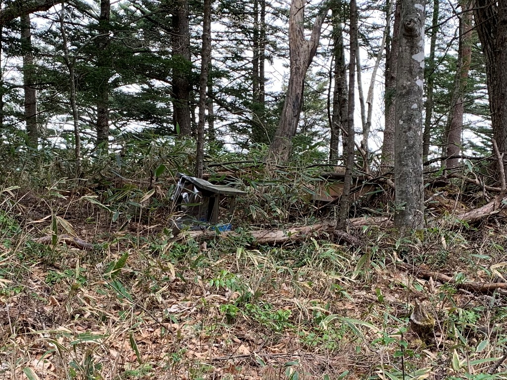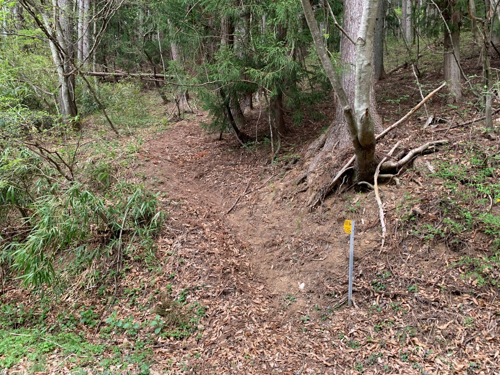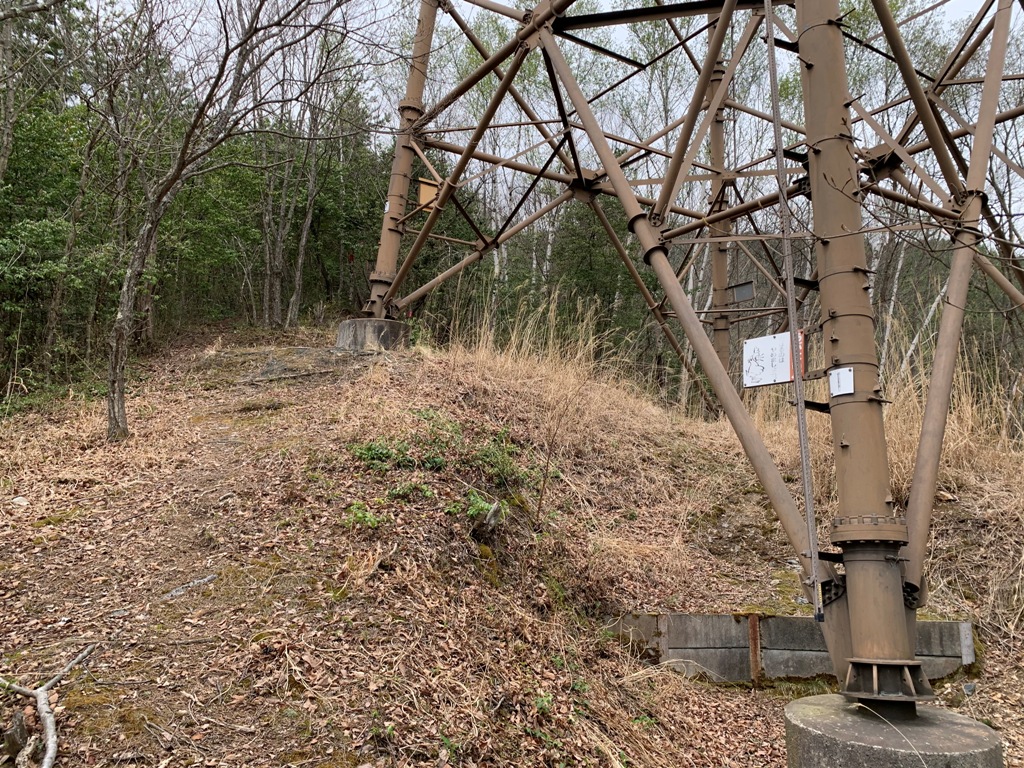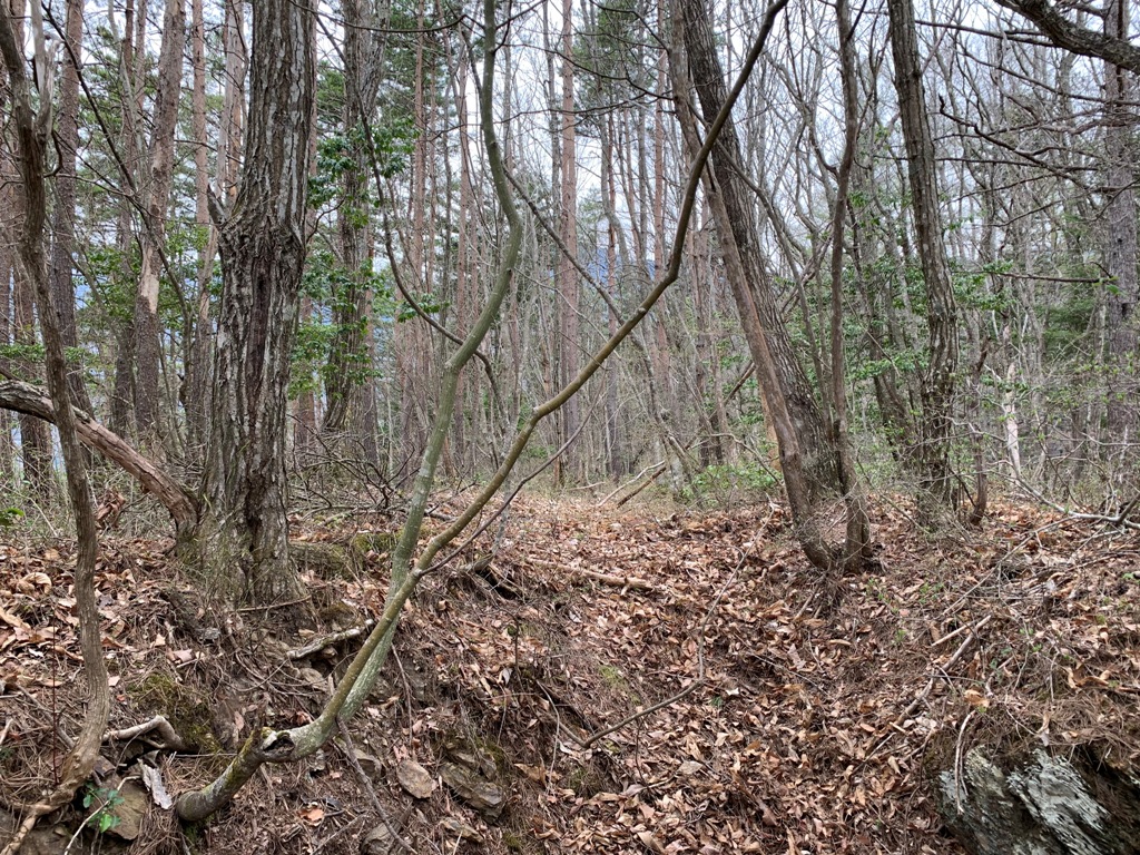 梓川ふるさと公園から小室浄水場に向かう。防獣柵を開け、林道を暫く進んだ分岐点を右に折れる。南黒沢川を超えると、金毘羅山南尾根にある送電鉄塔#1の保守通路の入口がある。他にも俵窪ル-トがあるが道がはっきりしない。保守通路は黄色い道標が随所にあるので、迷うことなく送電鉄塔#1に辿り着ける。そこから、両側が高い堀状の道が続き、堀部分を歩いたり、両側の高みを歩く。徐々に急峻な段丘上の斜面を超えて2の郭跡に着く。狭い登城路を進むと、小さな原形を留めない祠を発見する。その先が長細い平地の主郭跡だ。更に黒沢山方向に道が続くが、暫く行った先で引返す。往路は、送電鉄塔まで木に助けられながら下るが、そこからは15分程で林道に出る。往路は1時間以上かかったが、復路は40分程だった。