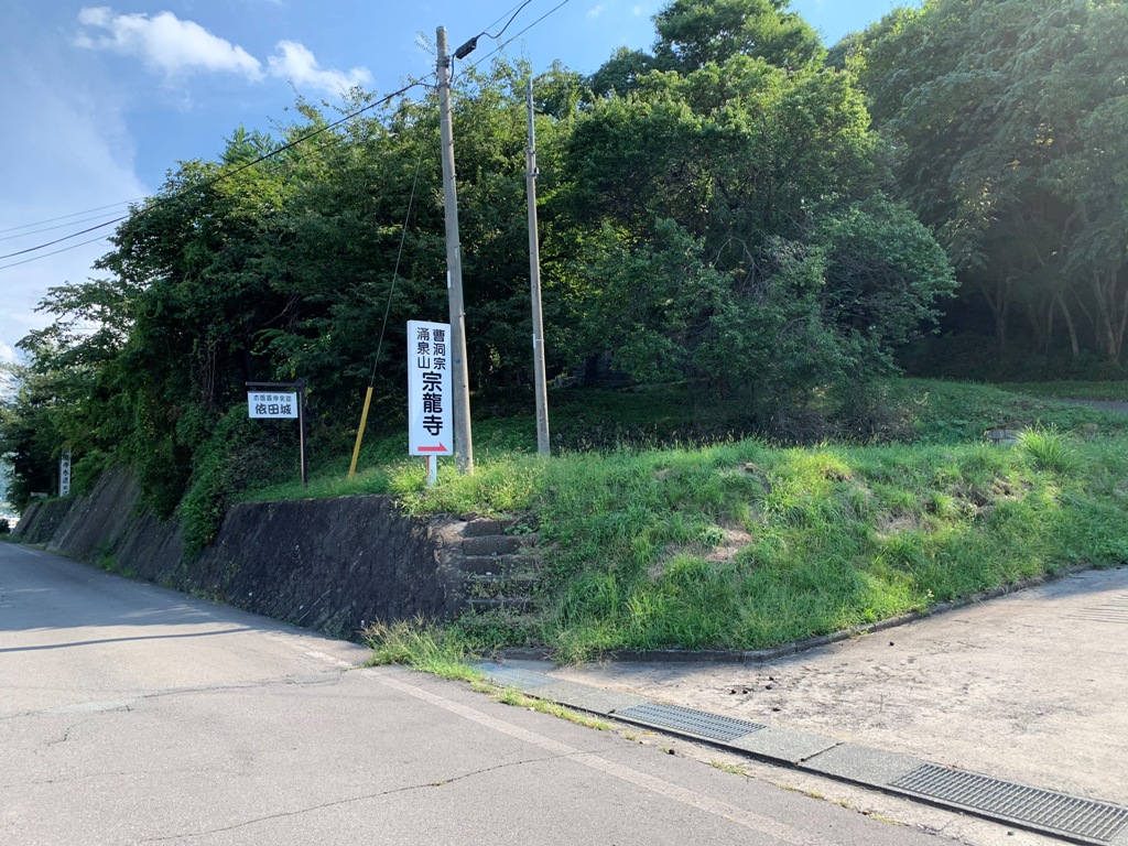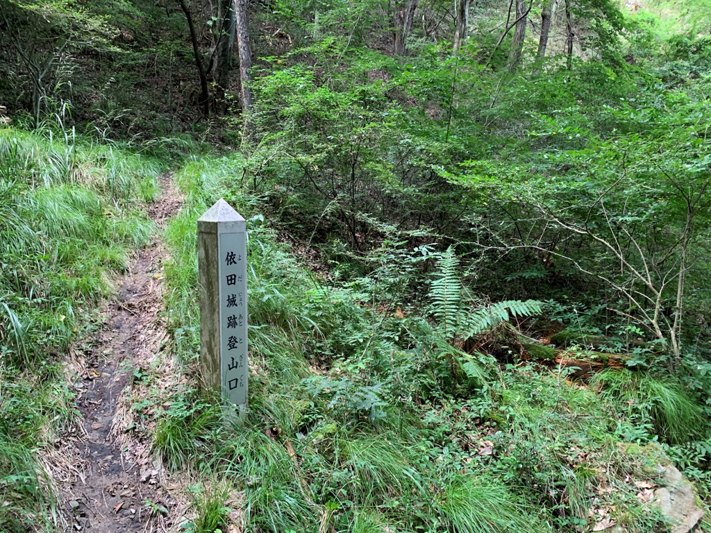 県道82号線依田川橋を西に入り、300m先を左折して宗龍寺の道標を右折する。依田城跡の道標に従い暫く行くと、未舗装の林道があるので、そこの広場に駐車する。そこから沢の右側の広い急な林道を登って行く。600m程行くと依田城跡登山口の道標がある。そこから右に入り、尾根先端から左に急カ-ブして、急な尾根を登ると山頂の主郭に着く。