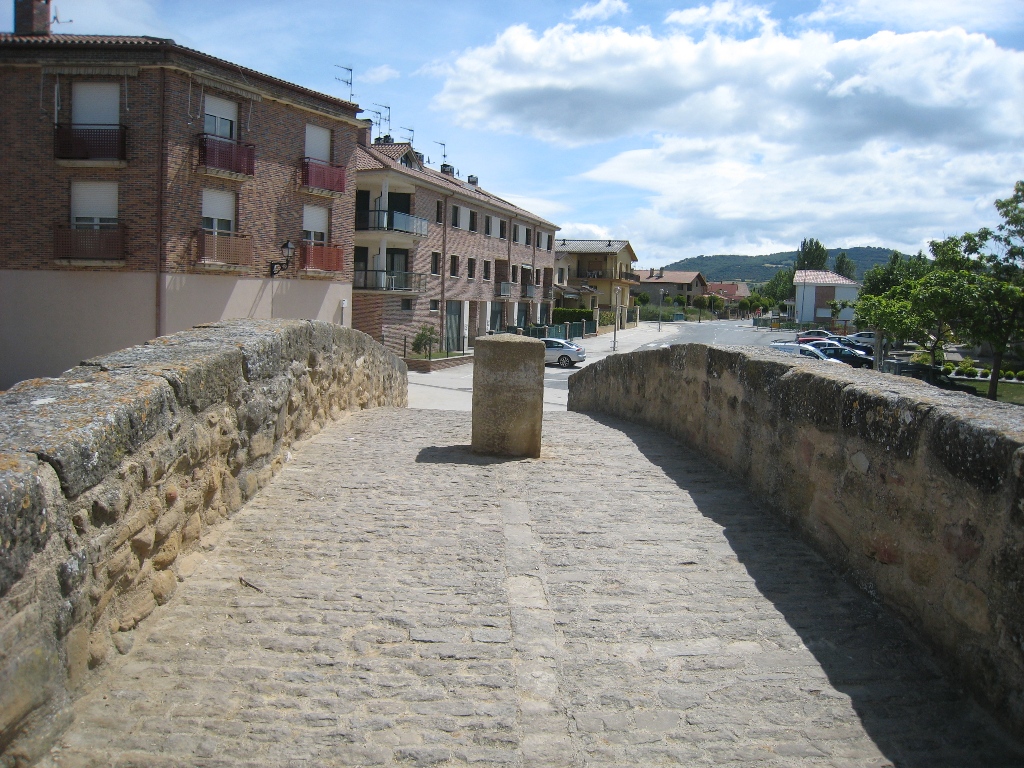 橋は三連のアーチから成り、厚みのある切石積みと緩やかな勾配が特徴である。欄干は低く、石畳の路面には長年の通行で生じた摩耗の跡が残り、幾世紀にもわたる巡礼者の足取りを感じさせる。中世にはこの地点に巡礼宿や施療院が置かれ、旅人は川を渡った後に休息と食事を得たという記録がある。現在も橋のたもとには古い教会や伝統家屋が並び、ナバーラ農村の静かな景観と調和している。