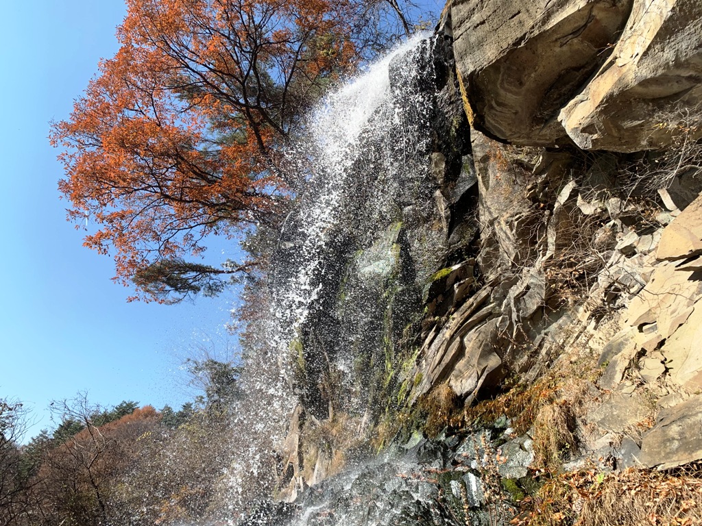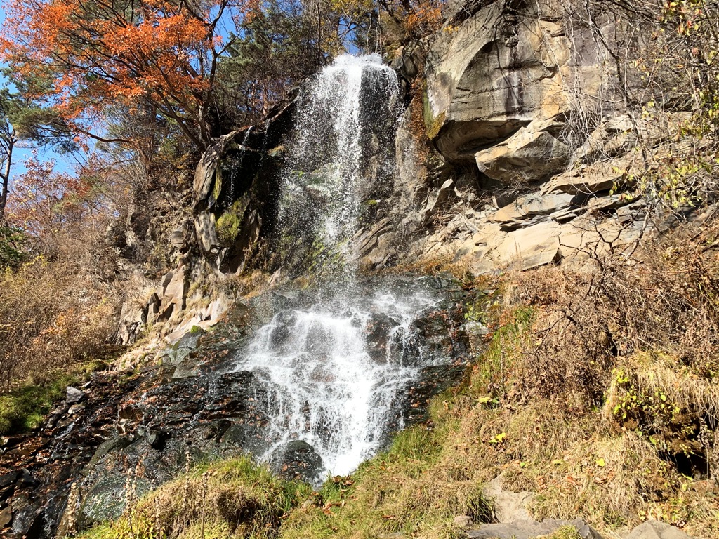 横谷渓谷入口にある滝です。蓼科山を水源とする「大河原堰(農業用水路)」の一部で人工の滝です。滝横手の紅葉が青空と白い滝飛沫に映えます。