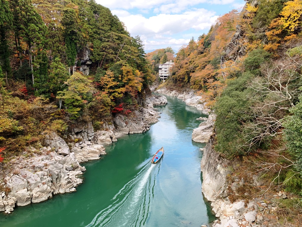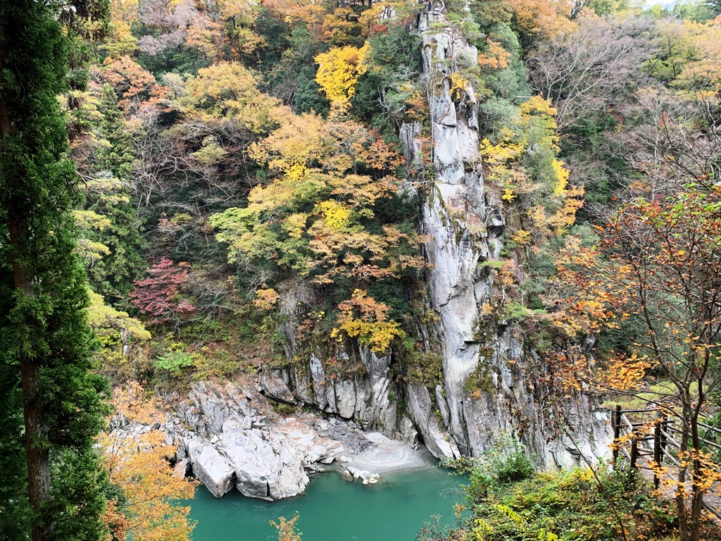 姑射橋(こやきょう)からじお藤山の遊歩道を通り、つつじ橋を渡って龍角峯の上の展望台を経て天龍峡を1周できる遊歩道があり、約1時間鮮やかな紅葉と天竜峡の奇岩、渓谷美を楽しめます。特に姑射橋たもとの市丸碑付近、龍角峯上のモミジのトンネルは見事です。