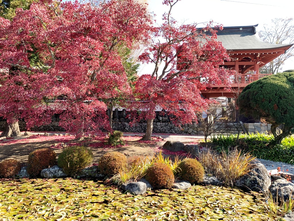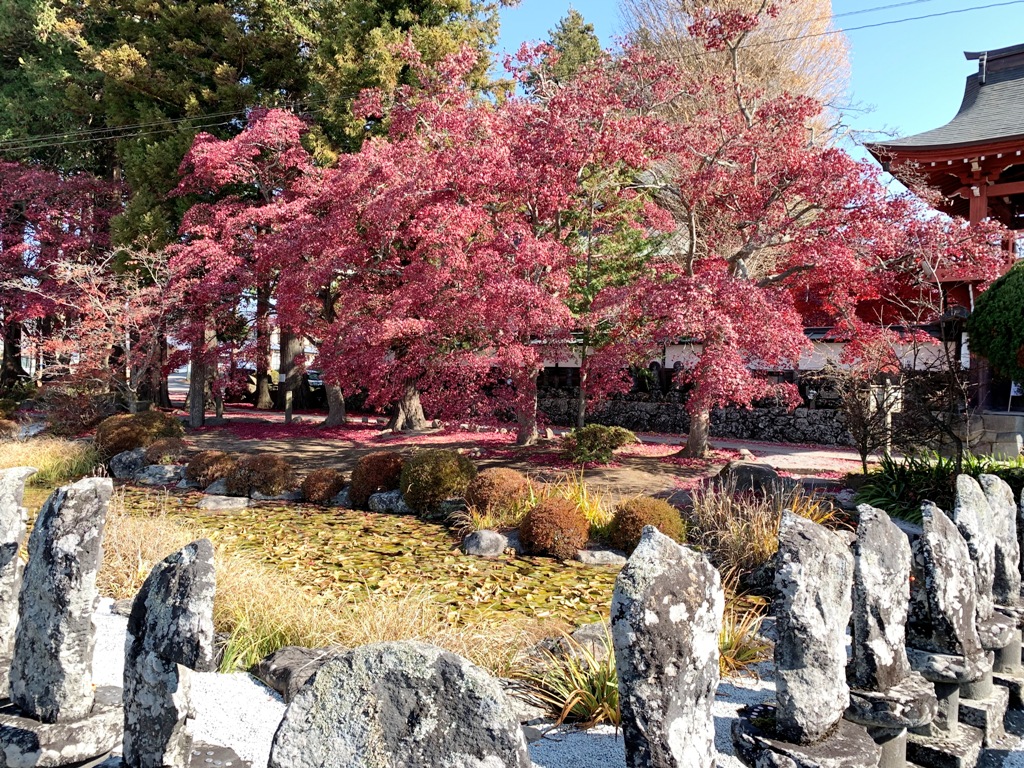 石仏百体観音とモミジのコラボレ-ションが見ものです。モミジは京都から持ち込まれた一行寺楓という品種なので他のモミジよりも一際赤く色づきます。