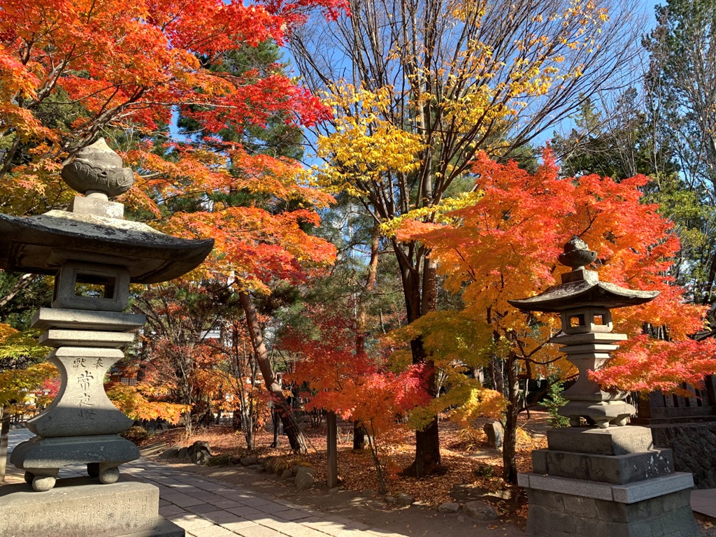 四柱神社は長野県松本市大手に鎮座する神社で、地元では、「しんとう(神道)さん」と呼ばれています。 天之御中主神、高皇産霊神、神皇産霊神、天照大神を祭神とし、4柱の神を祀ることから四柱神社(よはしらじんじゃ)という。 神社仏閣の紅葉は、京都、奈良がニュ-スで報道されますが、小さいながらもこの神社境内の紅葉はみごとです。特に鳥居入口の紅葉が陽にあたって光る様は何とも言えません。