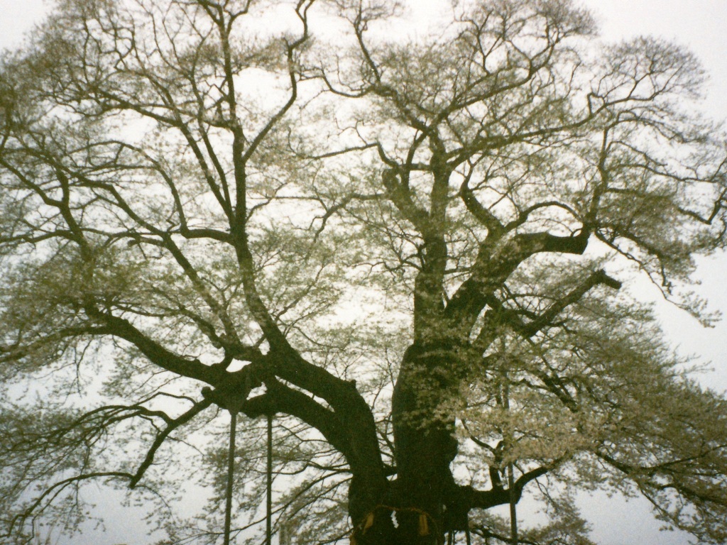 県下一の巨木と伝えられる醍醐桜は、のどかな山里の原風景の中にあって、ただ1本だけ空に向かってそびえ立つ圧倒的な存在感。日本名木百選にも選ばれると同時に、昭和47年12月には岡山県の天然記念物に指定されています。目通り7.1m、根本周囲9.2m、枝張り東西南北20m、樹高18m、種類はアズマヒガン(ヒガンザクラの一種)で、伝説によれば、元弘2年(1,332年)後醍醐天皇が隠岐配流の際、この桜を見て賞賛したといわれ、この名がつきました。樹齢は700年とも、また地元の説では1,000年ともいわれ、この見事な桜に魅せられ毎年満開の季節になると周囲が大渋滞になるほどに多くの花見客で混雑します。(真庭観光局HP転記)
