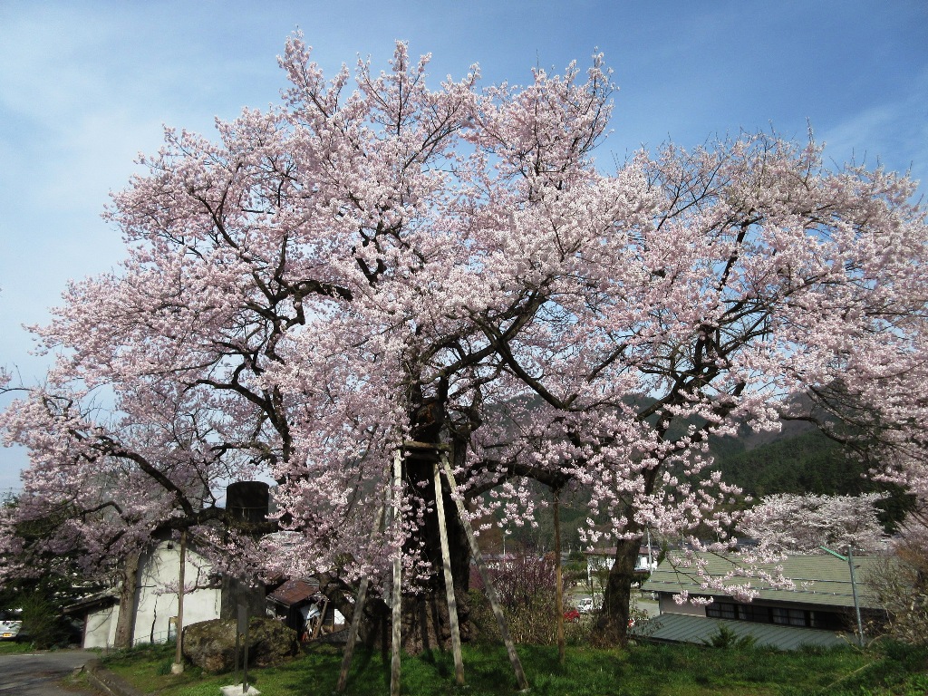 推定樹齢430年。根周り約6m、樹高約10mのエドヒガン。梢は東西南北に約15mに広がる市内最古最大の銘木、古木の風格と母木のやさしさを漂わせる姿は見事。 (須坂市観光協会HPから転記)