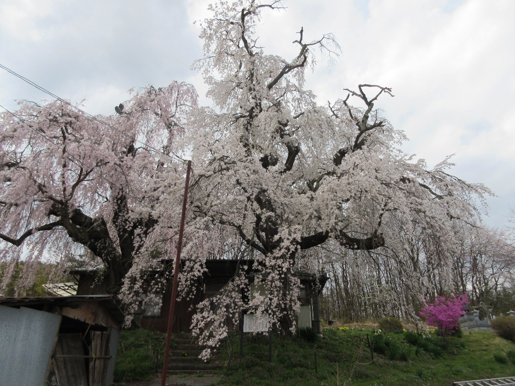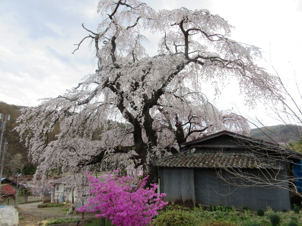 五本木地区にある2本のシダレ桜です。左側は少し赤っぽく、右側は白っぽく見えるので咲き分けの桜と呼ばれている。