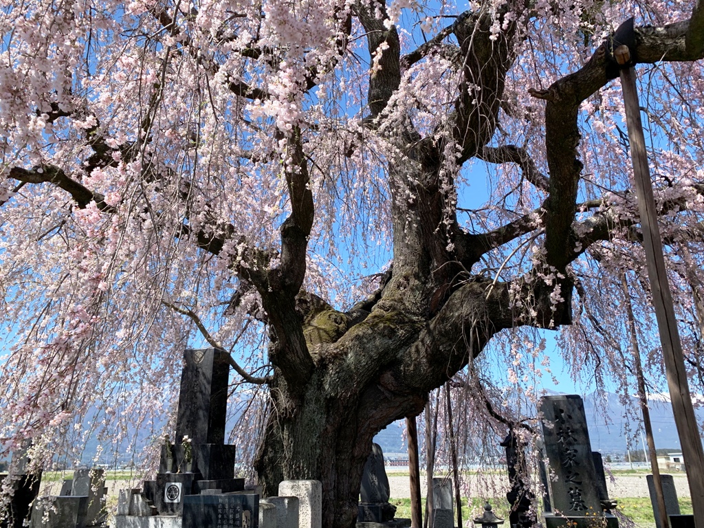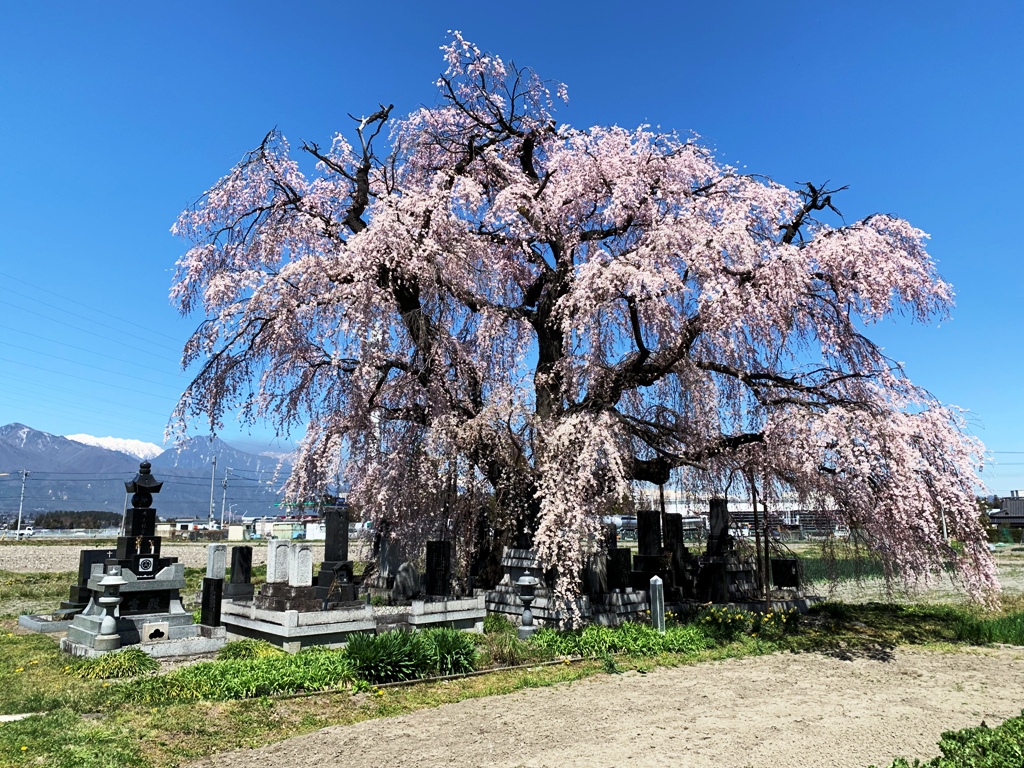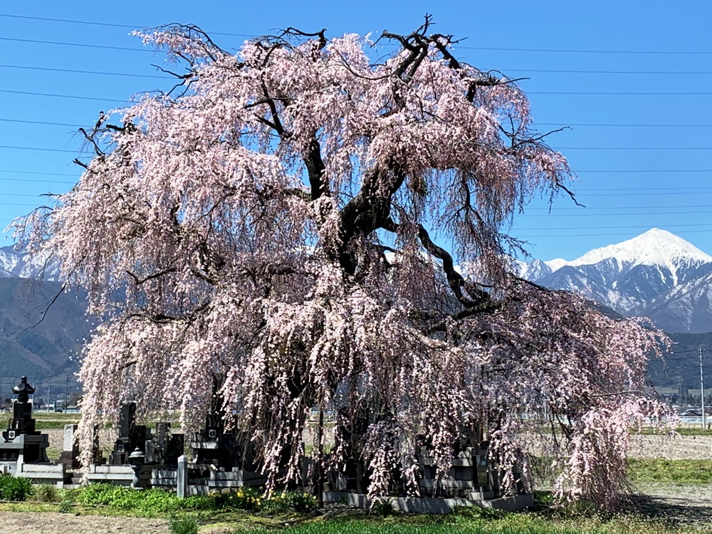 この大シダレザクラは、畑の片隅に墓を守るように花を垂らしている。常念岳を背景に、その姿は絵になる。平成20年10月に安曇野市の天然記念物に指定されている。