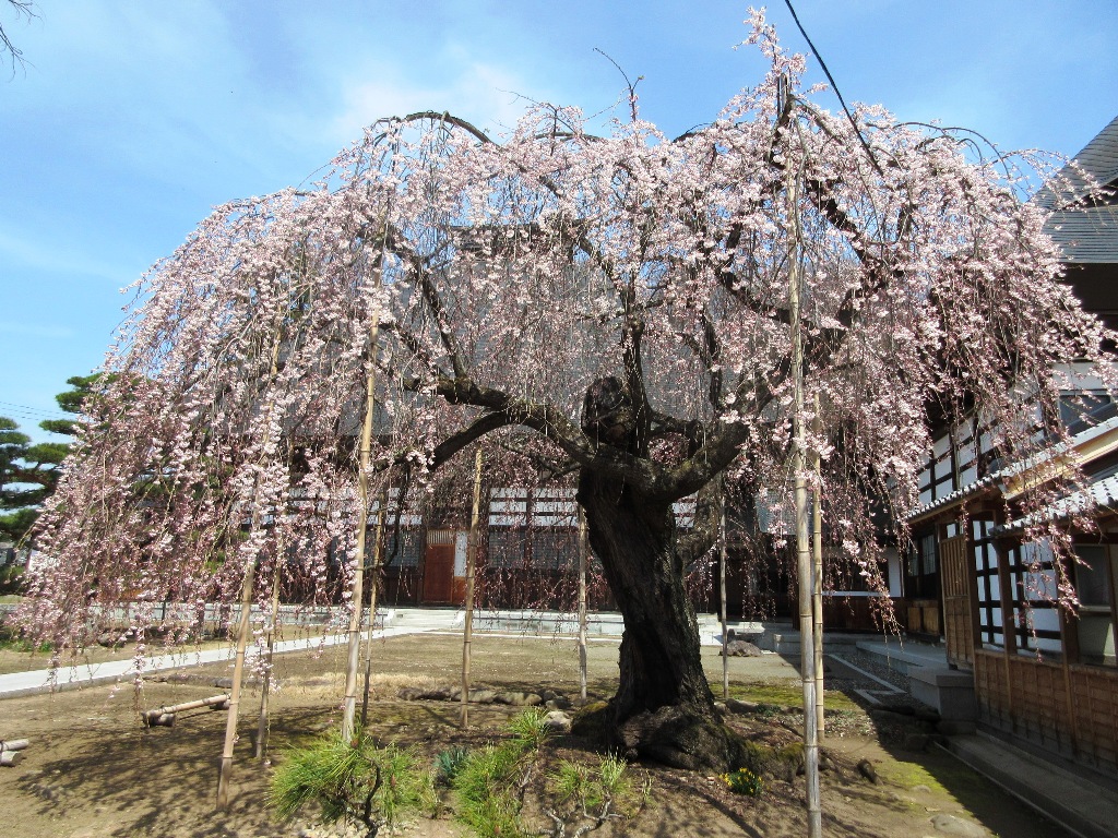 上杉謙信ゆかりの寺で、本堂の前に2本の枝垂れ桜が植えられている。