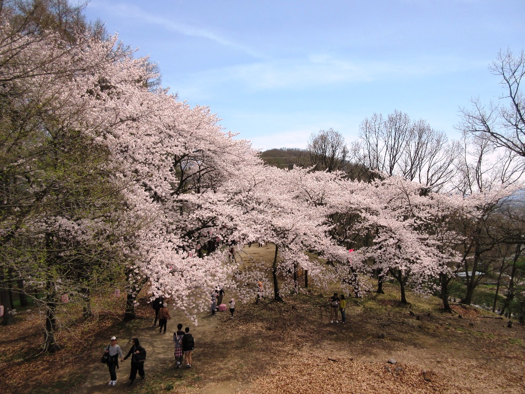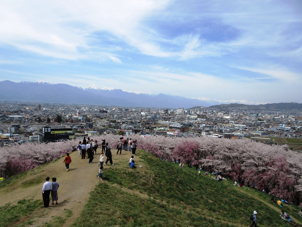 開花時期や種類が異なるソメイヨシノ、ヤマザクラ、シダレザクラなどが混在し、桜のグラデーションの変化も見事。 (新まつもと物語HPから転記)
