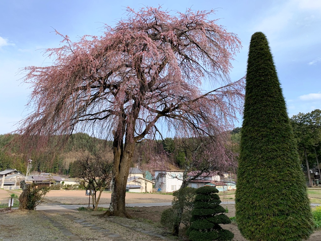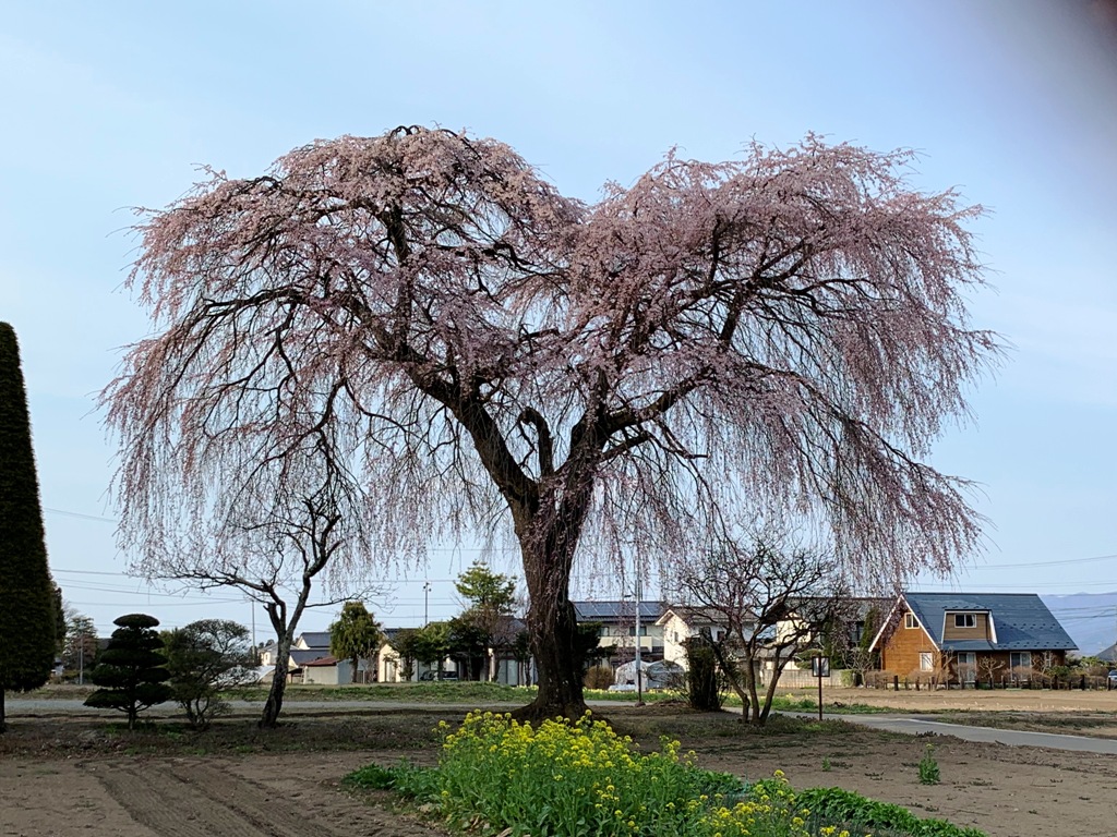 光輪寺は東筑摩郡朝日村にある高野山真言宗の古刹で、伝承によれば奈良時代に行基が開いた古薬師が始まりとされ、中興を木曽義仲が携わったとされている。本堂の南側には、長野県の県宝に指定されている茅葺き屋根の薬師堂がある。樹齢400年といわれるしだれ桜と里山を背景にした寺の佇まいが、何とも言えないのどかな雰囲気を醸し出しています。(信州桜紀行HPから転記)