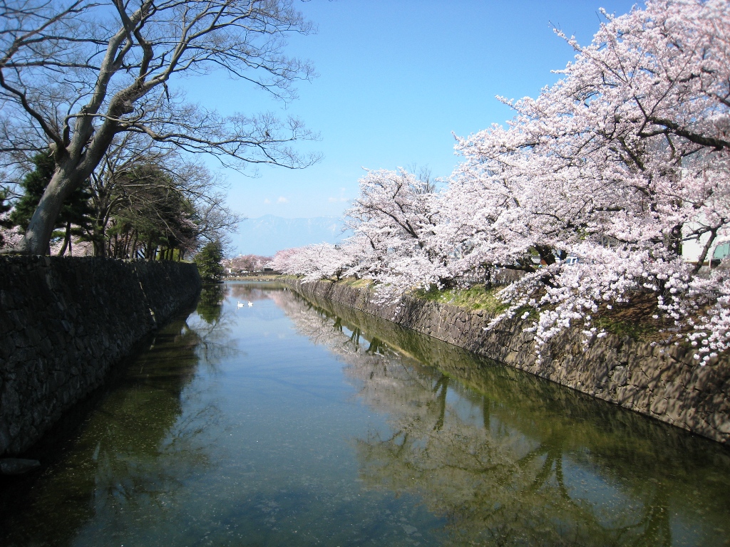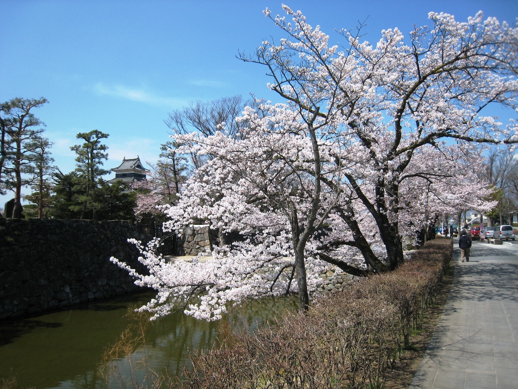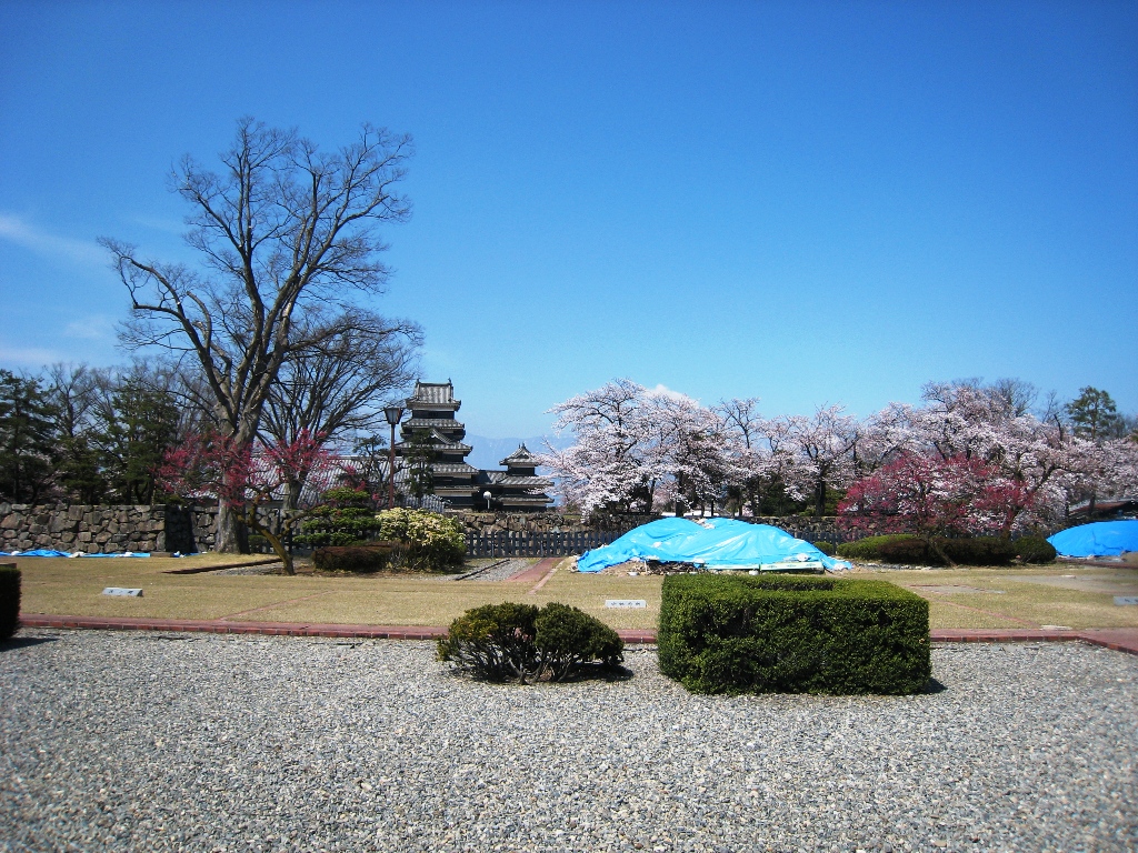 松本城公園や周辺のお堀には約320本のソメイヨシノ、コヒガンザクラ、シダレザクラなどが残雪の北アルプスを背に咲き誇ります。 (新まつもと物語HPから転記)