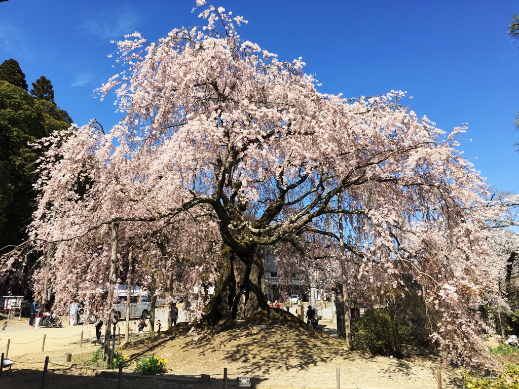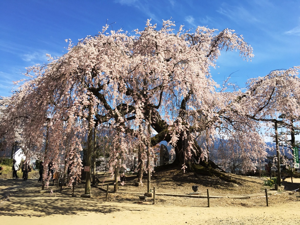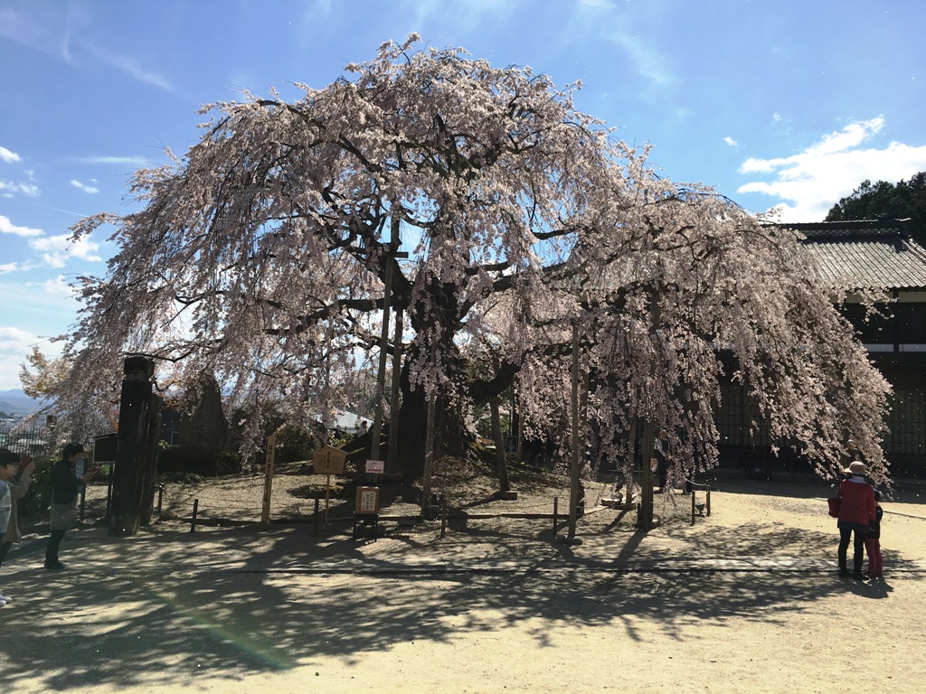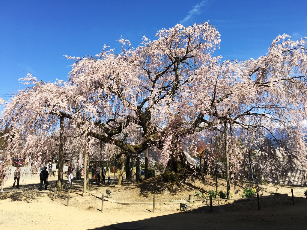 旧座光寺小学校舞台校舎前に植えられている。この地域唯一の新品種・半八重枝垂れ紅彼岸桜。樹齢約350年。舞台校舎や麻績神社、南アルプスを背景に様々なアングルで楽しむことができる。写真愛好家からも人気のある撮影スポットで、夜はライトアップがおこなわれる。(南信州ナビHPから転記)