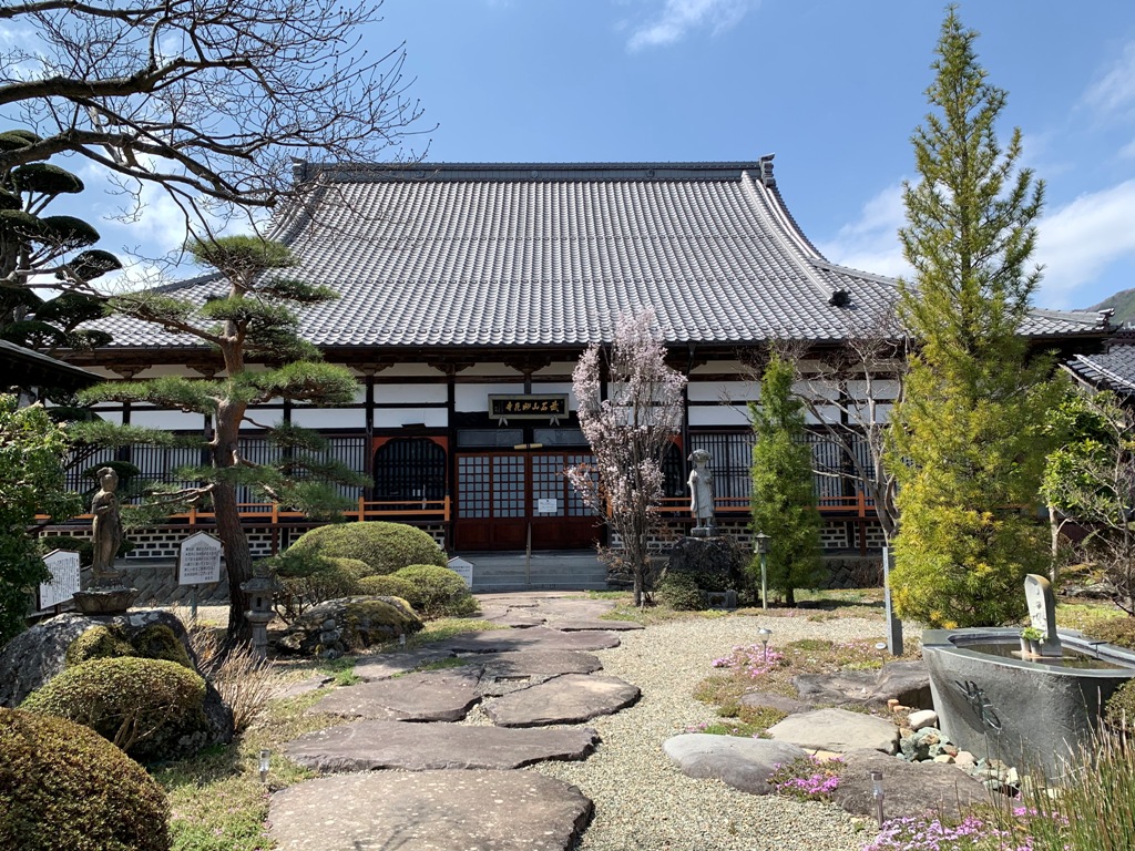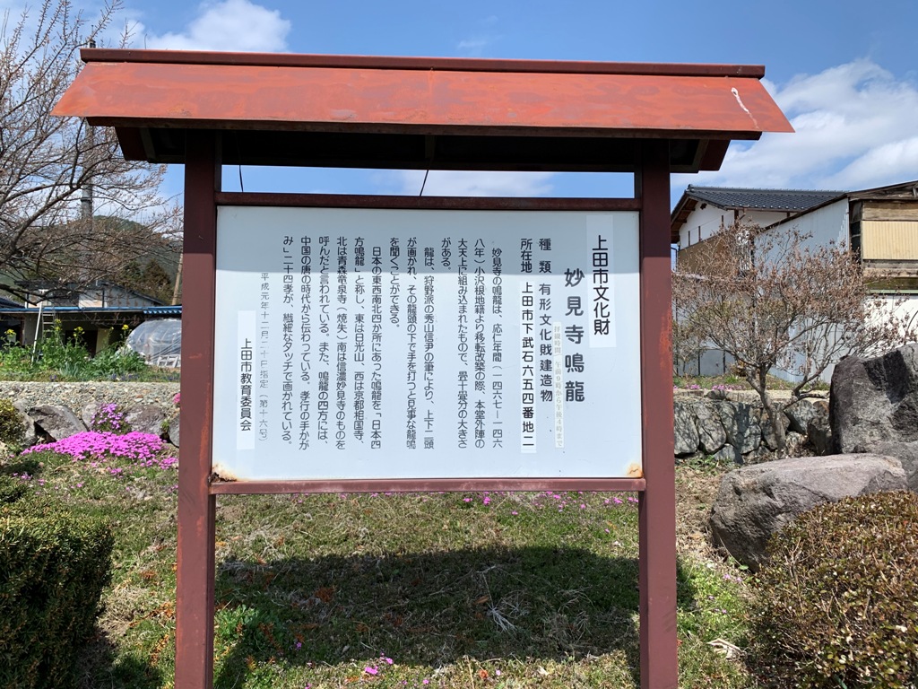 本堂外陣の大天井に組み込まれた畳十畳分に描かれた上下二頭の鳴龍が有名です。ここにも一本のしだれ桜が植えられている。