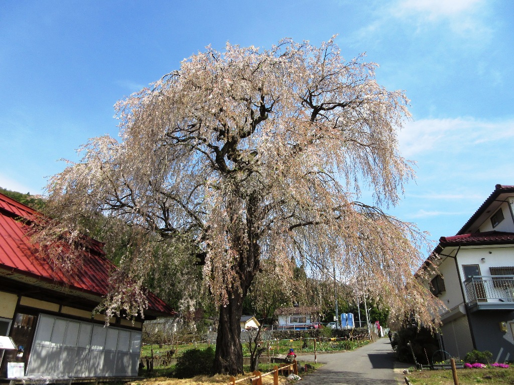 なかひら地区にある阿弥陀堂の傍、お地蔵さまを護るようにそびえます。樹高約10m、樹齢は約150年。幾重にも張り出した枝々が花で埋め尽くされると、さながら湧き立つ華の雲のよう。(高山村HPから転記)