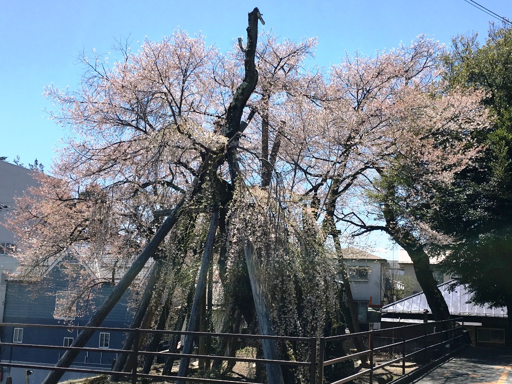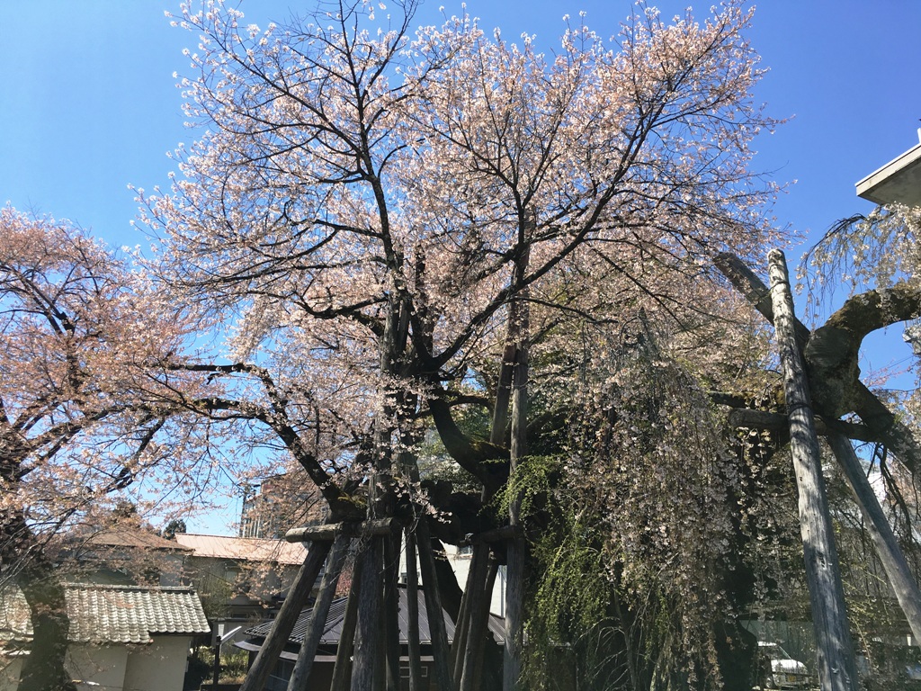 元飯田城桜丸御殿内にあるヒガン桜と枝垂桜の合体桜。推定樹齢400年。参勤交代の藩主夫妻は桜を愛で、しばしの別れを惜しんだという。(南信州ナビHPから転記)