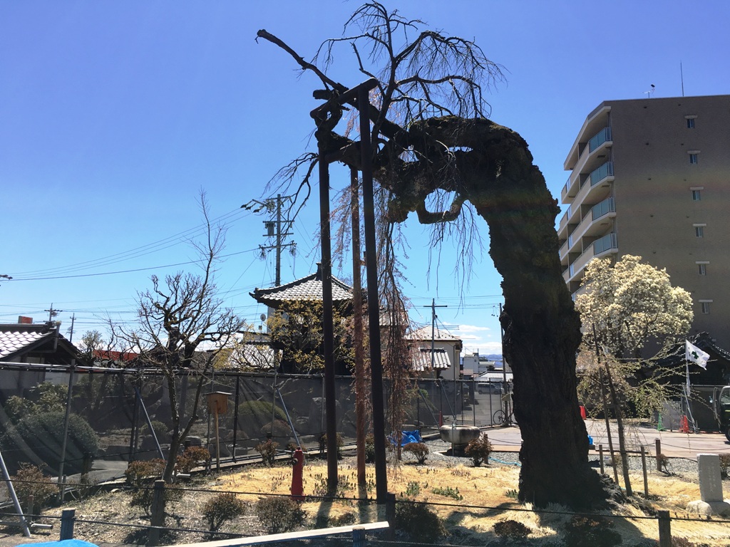 江戸町にある正永寺本堂脇に植えられている枝垂れ桜。樹齢400年以上。寺が上飯田から移築された頃に植えられたものと推測される。大火に何度も耐え、大瀑布のように片側のみ流れ落ちるように咲く。残念ながら、今は枯れてしまい傍に2世桜が植えられている。(南信州ナビHPから転記)