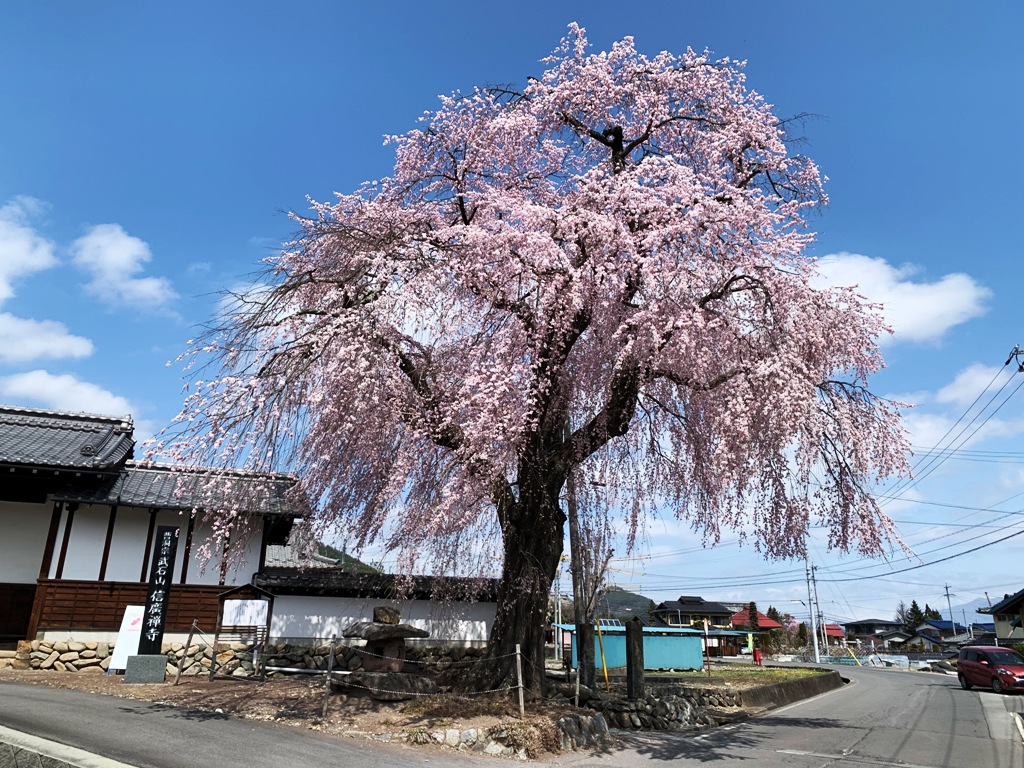 目通りの幹まわりは約3メートル、樹の高さが15メートルあり、武石地域で一番大きいしだれ桜である。