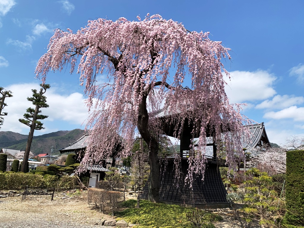 4月下旬から5月上旬にかけて開花し、しだれた枝に咲く花は遠くからも望むことができ、特に小沢根赤坂から望む姿は寺の景観と相まって大変みごとである(境内入口案内板から転記)。境内にも2本のしだれ桜がある。