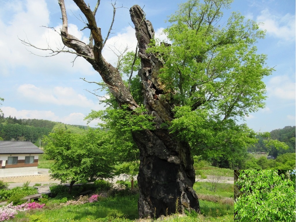 樹齢は約800年といわれ、桜といってもソメイヨシノなどのイメージとは違うイヌザクラです。花は5mmほどの梅花状で、遠くから見るとわかりにくいですが、側で見ると可憐な花が穂状についています。公園として整備されていて、のどかな田園風景の中にあります。(大町市観光協会 HPから転記)