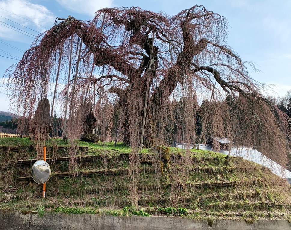 推定樹齢300年で樹高9m、幹周り5.1m(目通り)の巨木です。流れるように咲く花は見る人を楽しませる。また近くには巨岩「舟石」がある。 桜の開花期間中は夜間のライトアップがある。