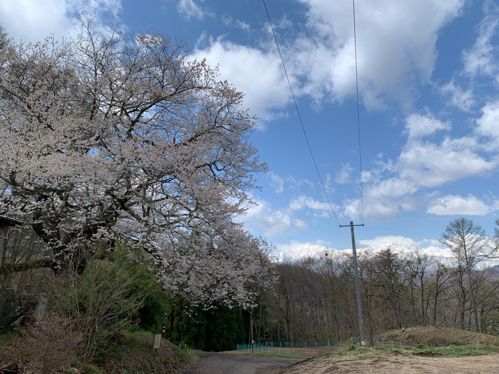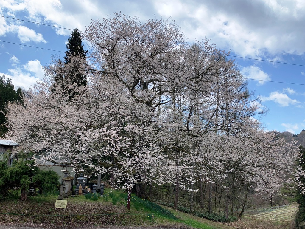 樹齢350年以上と伝えられて久しいエドヒガンザクラ、樹高およそ15m。昭和54年に村天然記念物に指定されました。「番所の桜山」一帯に花を咲かせている桜木は、この桜の種から発芽させた台木にベニシダレザクラを接木したものです。(案内板転記)