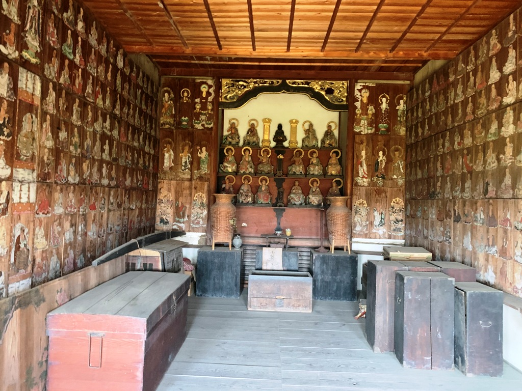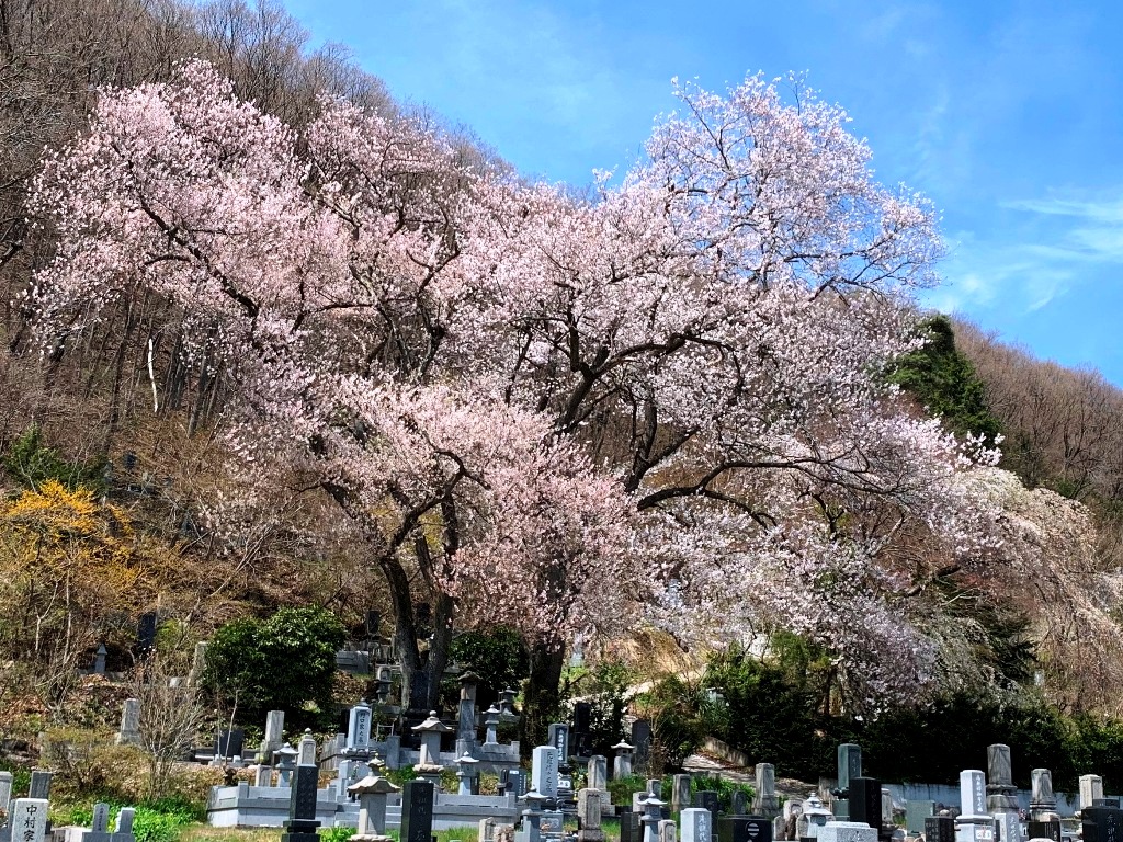 天照寺は石積みの石灯篭と羅漢堂が見所です。羅漢堂の側面に石仏が、堂内正面に16羅漢の尊像、測3面に484人の羅漢が描かれている。その横手と奥の墓地にしだれ桜が植えられている。高台にあり、善光寺平と背後の菅の平、志賀高原が見通せる。