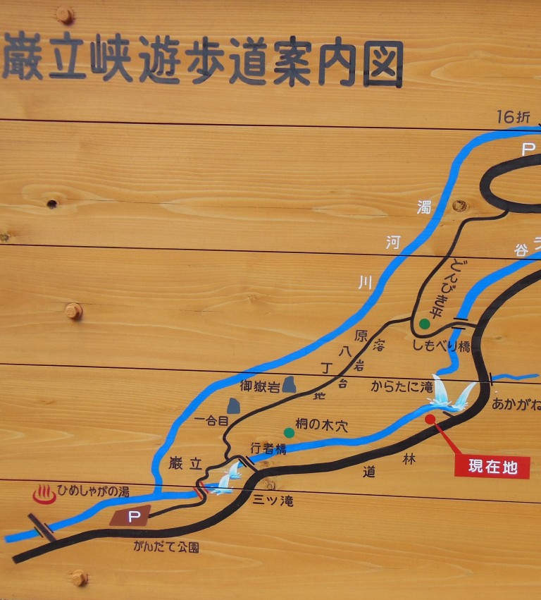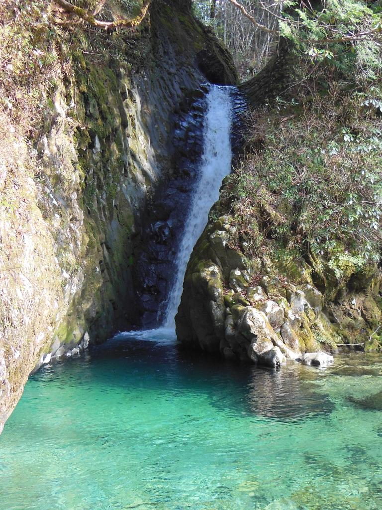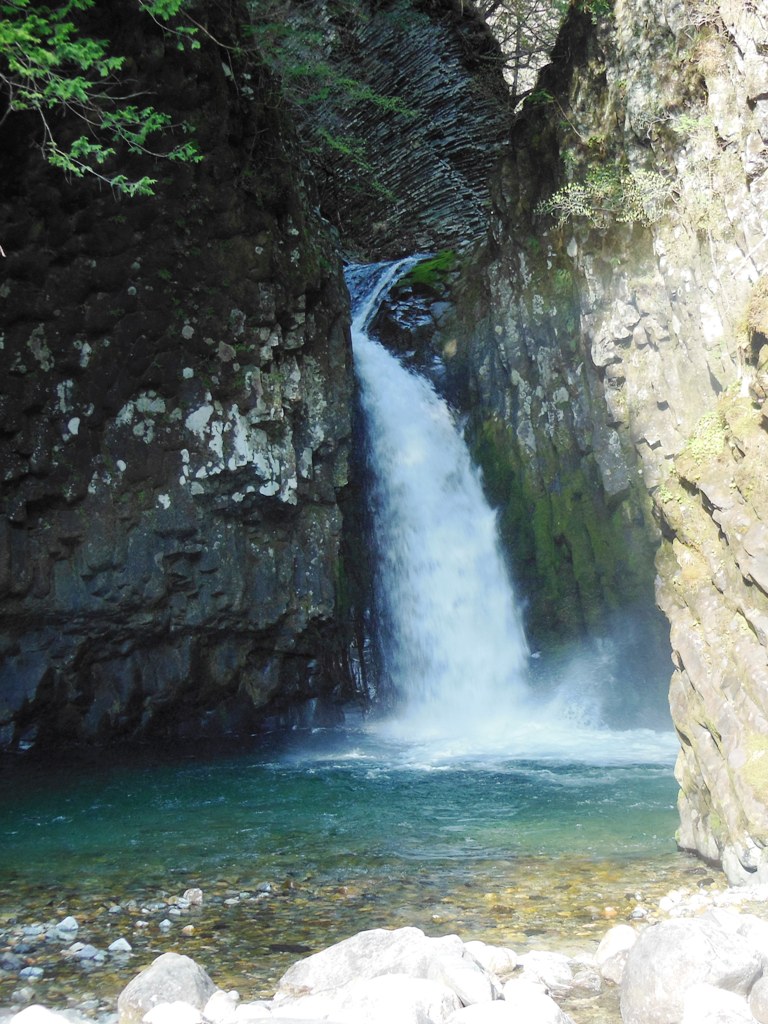 椹谷の支流、から谷合流点近くにあり、溶岩が滝の水に削られて、銅のように見えることから、「あかがね色のとい」という意味から名付けられた滝。落差14m、幅3m。(下呂温泉観光協会HP転記)