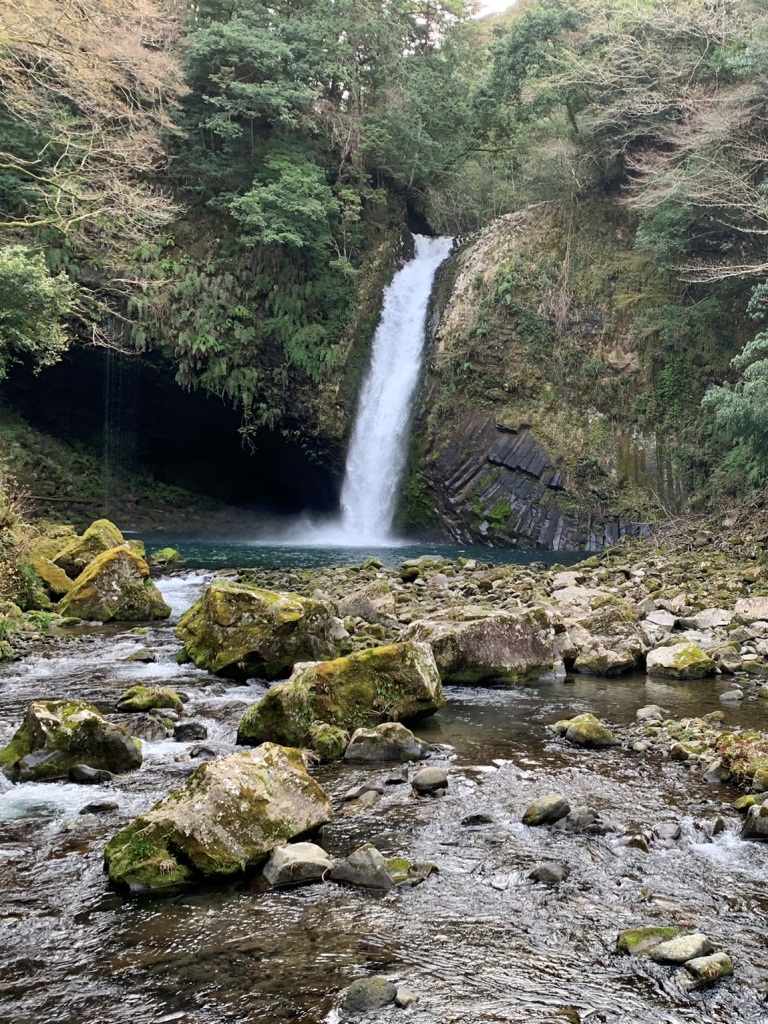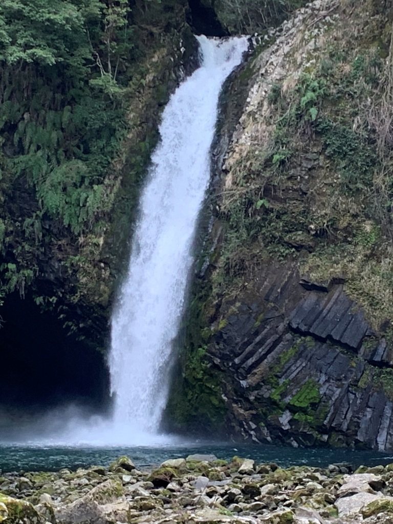 深い樹木が生い茂る中、玄武岩の崖に高さ25m、幅7mの滝がかかっていて、山の冷気と水しぶきで夏でも肌寒いほど。滝の玄武岩には、天然記念物のハイコモチシダが群生しています。浄蓮の滝は日本の滝100選に選ばれています。(伊豆市観光情報HP転記)