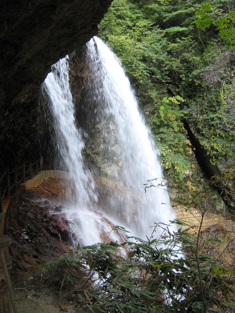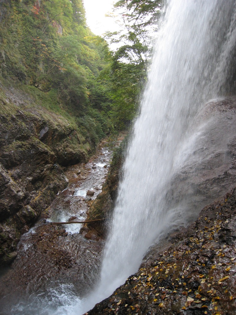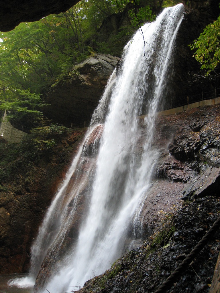 松川本流が雷鳴のように轟音を立てて落下しているので「雷滝」といい、滝の裏側を通り見れることから別名「裏見の滝」とも言う。 この奥142mにあり、落差約30m川幅29m、左の岸壁の高さは約40mある。 この滝は、珪化されて硬くなった凝灰角礫岩で松川の侵食によってできたものである。滝口は流路の変化にとって変わっており、侵食されていく様子を見ることができる。(案内板転記)