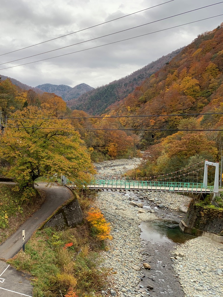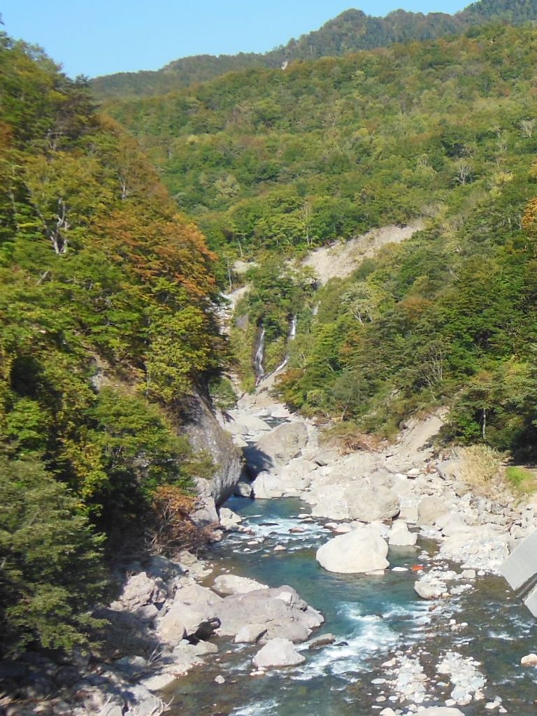 切明温泉の雑魚川と中津川に架かる切明橋の上から川の下流側を見ると二本の滝が見えます。