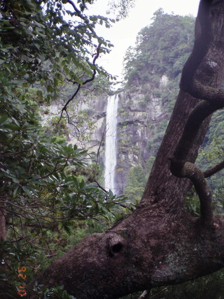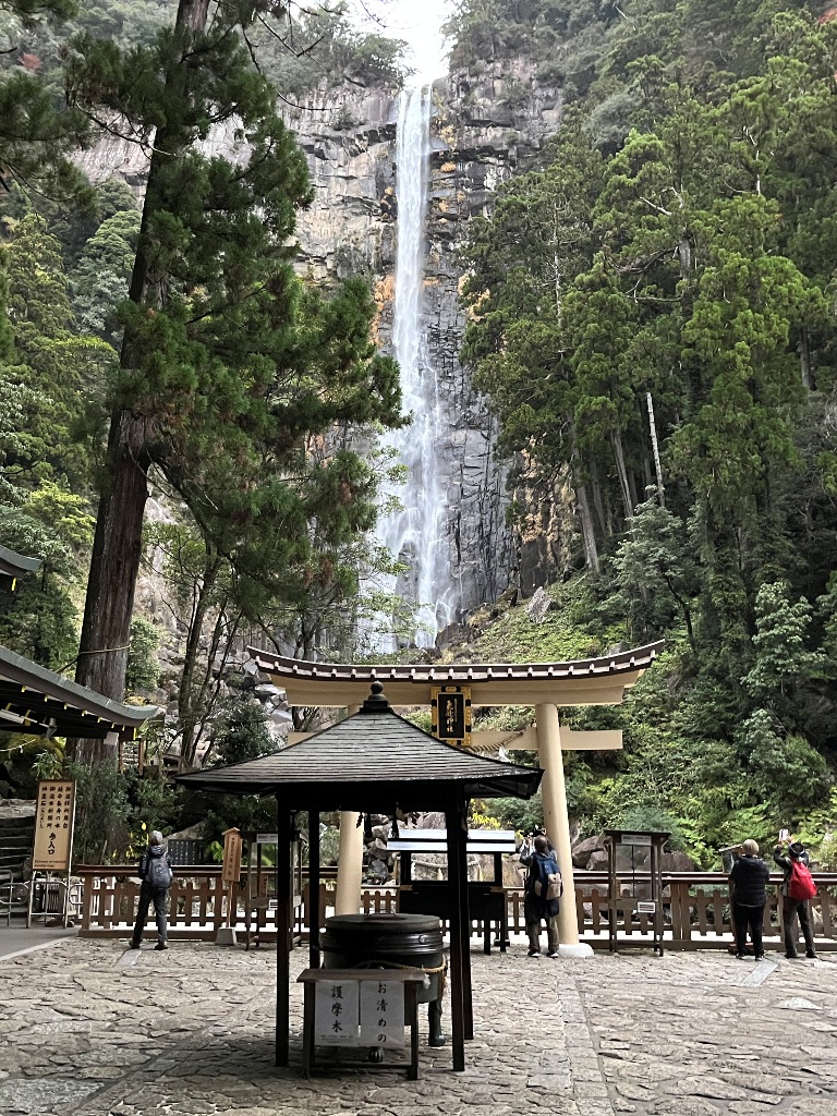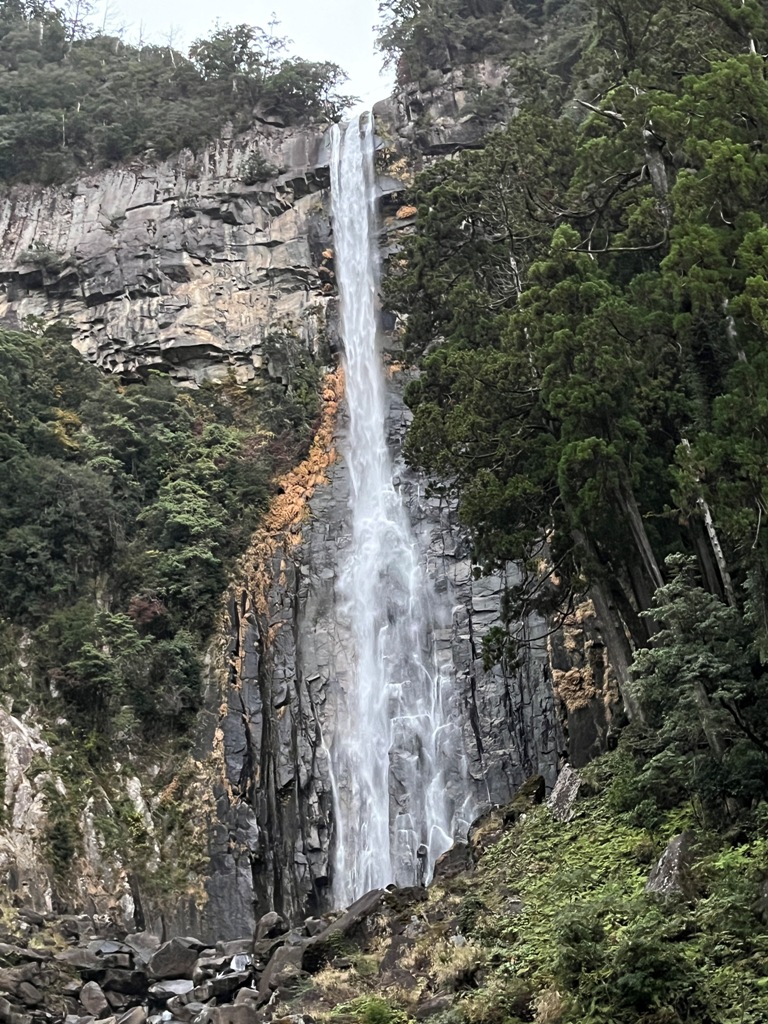 那智山の奥山、大雲取山から流れ出る本流にいくつもの流れが重なり合い、ついには原生林を切り裂くように落下しているのがこの「那智の滝」です。水柱は落差133m、銚子口の幅13m、滝壺の深さは10mの名瀑で、落差は日本一です。銚子口の岩盤に3つの切れ目があって、三筋になって落下し始めるところから、「三筋の滝」ともよばれています。(和歌山県公式観光サイトHP転記)
