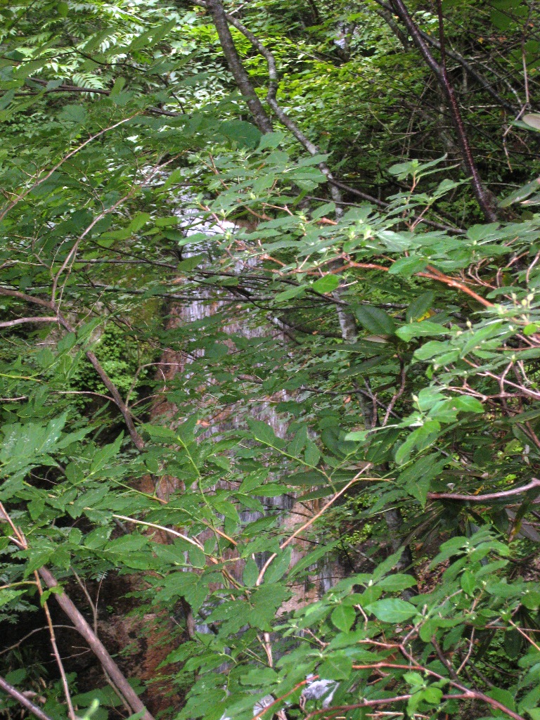 有明山登山道を少し登ったところにある。滝は3段で、木が生茂り見えにくい。