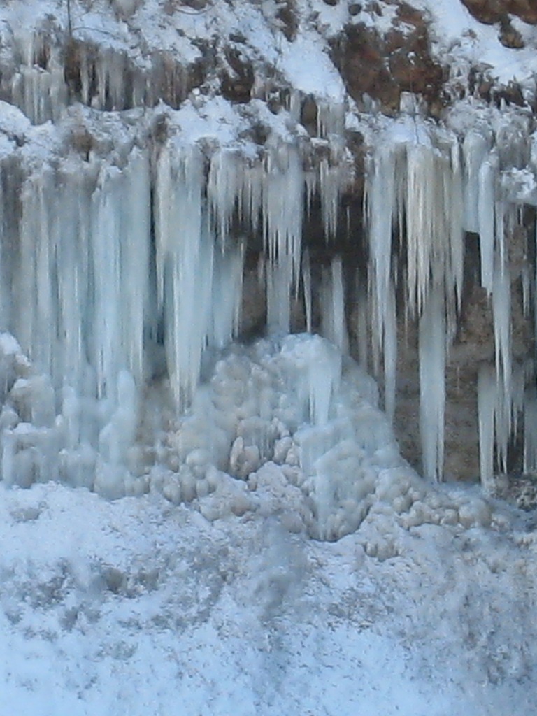 冬季に西野川をはさんだ対岸の崖には、上部よりしみだした地下水が凍りつき氷柱の壁を作る。 厳冬期(1月~2月)には巾250m、高さ最大50mの巨大な氷柱の壁となる。(案内板転記) 滝ではないが、見た目が滝のように見えるので掲載した。