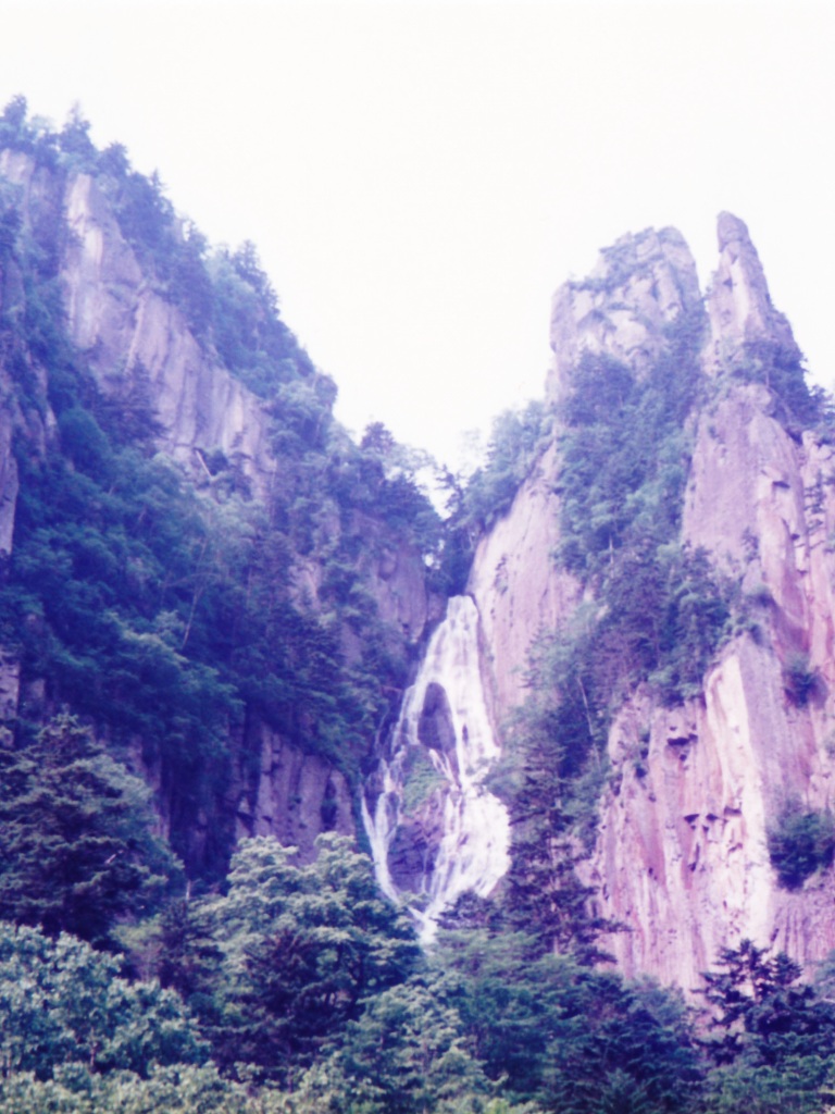 石狩川沿いに延々24kmにわたって続く断崖絶壁。この崖を流れ落ちるいくつかの滝の中でも、もっとも美しいふたつの滝があります。細く繊細な白糸のように優美な姿で流れ落ちる「銀河の滝」、太い1本の滝となって力強く流れ落ちる「流星の滝」。日本の滝百選にも入っている名瀑を、 駐車場から間近に見る迫力ある姿は圧巻です。滝を背に20分ほど斜面を登ると、「双瀑台」の展望台へ。別名女滝・男滝とも呼ばれる、2本の滝が絶壁・不動岩の左右を流れ落ちる姿を同時に見ることができます。(層雲峡観光協会HP転記)