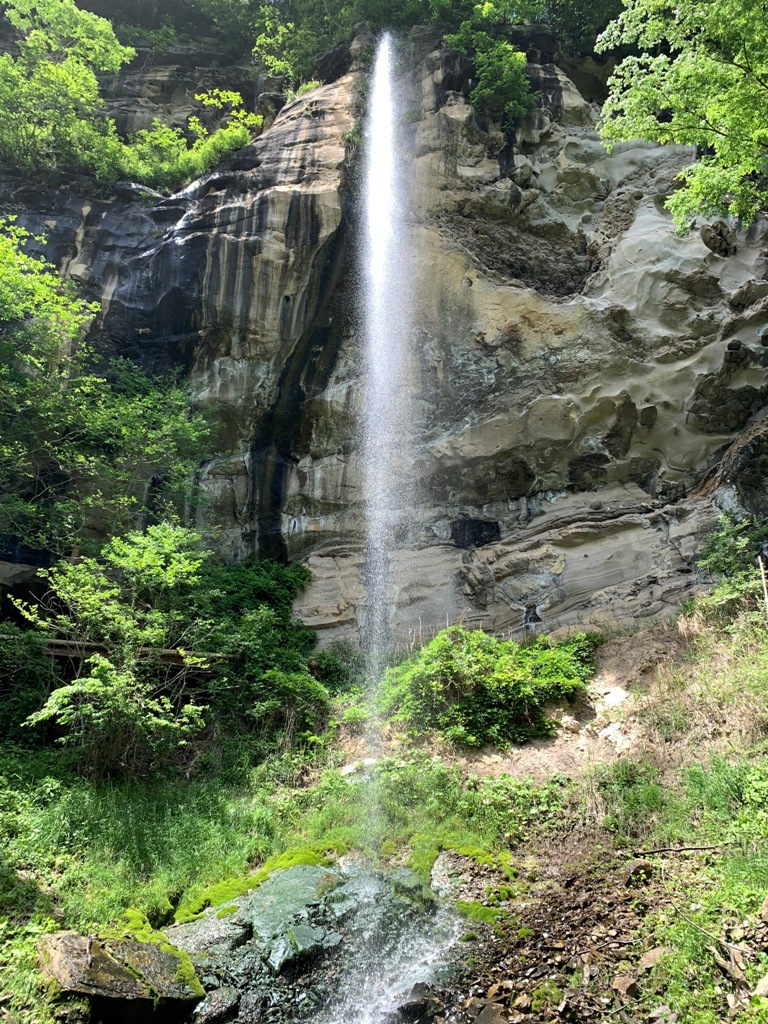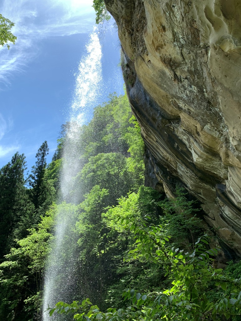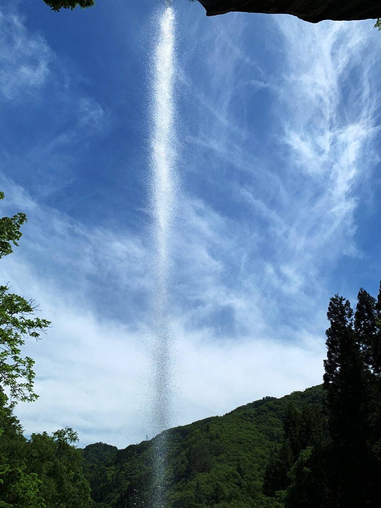 断崖絶壁の崖から糸が垂れるように流れ落ちています。落差は約50m。滝の裏側に小道があり、滝を裏から見られることから別名裏見の滝とも言われています。冬期には、滝から流れ落ちる水が凍り、巨大な氷瀑となります。傍らのお堂に弘法大師が祀られていて大滝の弘法さまとして親しまれている。