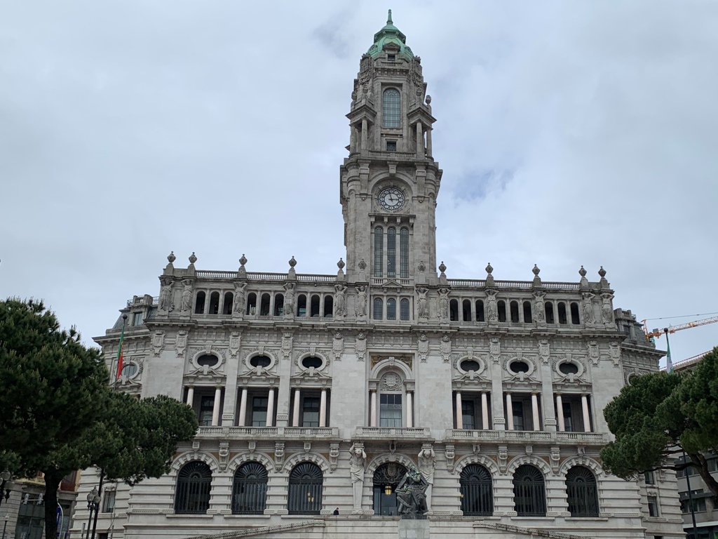 上から見たポルト大聖堂は直ぐ傍に見えたが、歩くと複雑に入組んだ路地に迷い、方向違いの市役所(Câmara Municipal do Porto)に着く。再び雨が降り出したのでホ-ルの壁に飾られたアズレ-ジョが有名。
