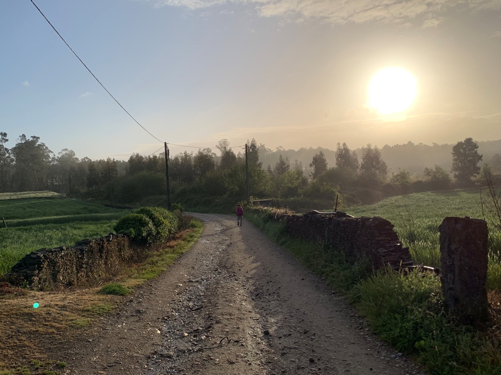国道(N-204)を少し上って下りにかかり、暫く行くと十字架のある真新しいノサ・セニョ-ラ教会(Igreja Nossa Senhora de Fátima)がある。巡礼路はそこの階段を降りた広場を通り、農道へと繋がっている。ネイヴァ川(Rio Neiva)に架かるタバス橋(Ponte Das Tábuas)を渡る頃、ようやく太陽が畑越しに顔を見せる。