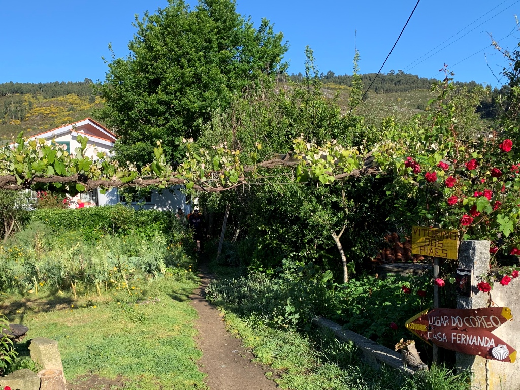 国道(N-204)を横断して狭い住宅地の路地を歩いていると、道路上の馬と出くわす。パンを一切れ与えると、何と私たちに付いてくるではないか。それから20分程、付かず離れずついてきた。地元の人らしき人に、ようやく追い返してもらう。そこから林の中を進み、サン・セバスチャチャペル(Capela de São Sebastião)のある十字路で国道(N-204)を再び横断し、葡萄畑の中を進む。すると巡礼者がたむろする花で囲まれたホタテのついたLugar do Corgo Casa Fernandaと名前の案内板がある家があった。後で確認すると、ユ-スホステルだった。再々度国道(N-204)を横断すると、15分程のところに教会のような建物の議会(Junta de Freguesia de Vitorino dos Piães)がある。巡礼路は国道(N-204)に沿って続いている。そこから山道になり、民家には花が沢山植えられている。道沿いには白いサトイモ?科と思われる大きな花が群生している。国道(N-203)に出ると、ファッシャ(Facha)の表示があり、Ponte de Limaまで10.4Km、2時間6分の細かい数字表記のところを左折して、急坂の山道となる。そこをスピ-ドを出して走る自転車にびっくりする。20分程歩いて道路に出て、すぐ左折するところにPonte de Limaまで9Km、1時間49分の細かな表示をしている。そこから先Ponte de Limaまで同様の表示が沢山ある。スナックバ-(Bogani Desperta Mariaestina)で朝食休憩とする。