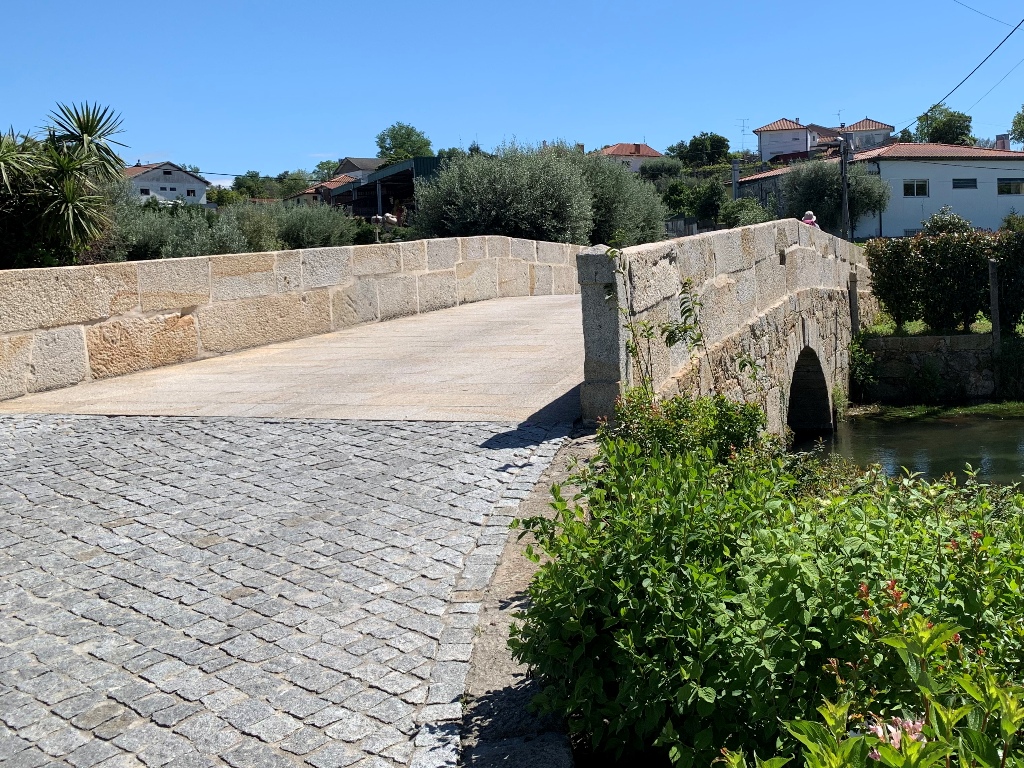 教会の裏手から山道に入り、20分程いくと視界が開け、ヴァレンサ(Valença)の町まで見通せる。急坂を下ると、再び山道となる。田んぼの畔みたいなところを出ると、チャペルと出くわす。40分程田舎道を行くと、まだ10時半というのに泊り客らしい人影が見えるアルベルゲ(Albergue Quinta Estrada Romana)がある。そこには各巡礼地までの距離が派手に表示されている。10分程で小さな川に架かる石橋(Ponte Pedreira)にかかり、傍には食事、宿泊の出来る建物がある。