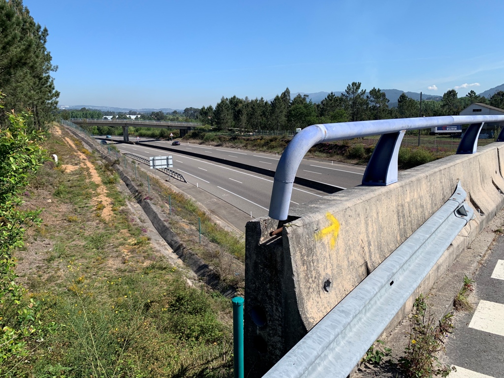 線路をまたぎ、ティント川橋(Ponte Rio Tinto)を渡る。30分程行くと、一般道(CP-0206)の高架橋が見える。手前を右回りに迂回して高架橋に一旦出て、直ぐに左折する。暫く行って一般道(CP-0206)戻り、上り坂となる。12時頃、カフェテリア(Casa da Cultura)に入り、小一時間昼食時間を取る。それから林間地帯を高架橋(AG-56)下、線路高架橋、ソル川(Rio Sol)の橋(Ponte Vella)を経由して1時間強歩くと、分岐の道標に出くわす。どちらのル-トも一般道で、直ぐに合流するので直進する。