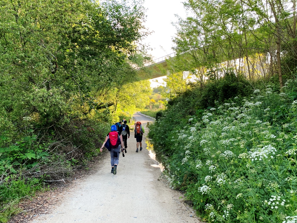 写真はすべてiphoneで撮影していたが、昨夜まで時間設定がポルトガル時間になっていた。そのため写真の撮影時間が1時間遅れていた。気がついたので、スペイン時間になるよう、時計を自動設定に変更する。今日も夜明けとともに出発する。街中では清掃員が昨夜の始末をしている。ペレグリーナ教会(La Peregrina)前を通り、ホテルを出て23分でレレス川(Rio Lérez)に架かるブルゴ橋(Puente del Burgo)に着く。その頃、ブルゴ橋からレレス川の川面が朝日で赤く染まりつつあった。道路を30分程歩くと、林に入り水飲み場がある。そこでブラジル2世のおじさんに会い、身の上話をされる。やがて線路の見えるところに出て、線路と並行して歩くかたちになる。線路下を抜け、人間のモニュメントがあるサンタ・マリア教会(Santa Maria de Alba)前を通過する。再び線路下を抜け、一般道(PO-225)を暫く歩き右折する。