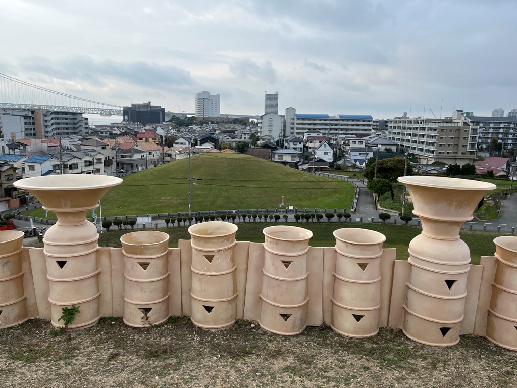 五色塚古墳とほぼ同じ時期に築造されましたが、築造当時から斜面には石は葺かれていませんでした。現在はよくわかりませんが、周囲は堀で囲まれ、きちんと2段に築かれていたそうです。
