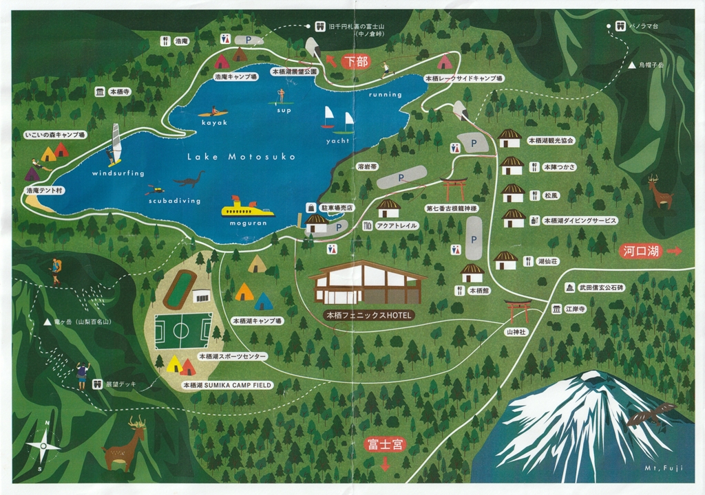 本栖湖ではキャンプ、カヌー、ウインドサーフィン、釣りなどが楽しめます。また、他の富士五湖と比べてそれほど観光地されてなく、自然の原始的な雰囲気が色濃く残っています。一方で、湖畔には環境保全への配慮が求められており、自然と人との共存が重視されています。(イラストは本栖フェニックスHOTELガイド資料)