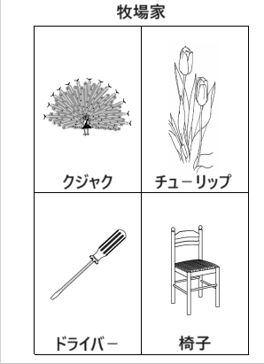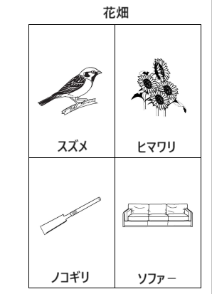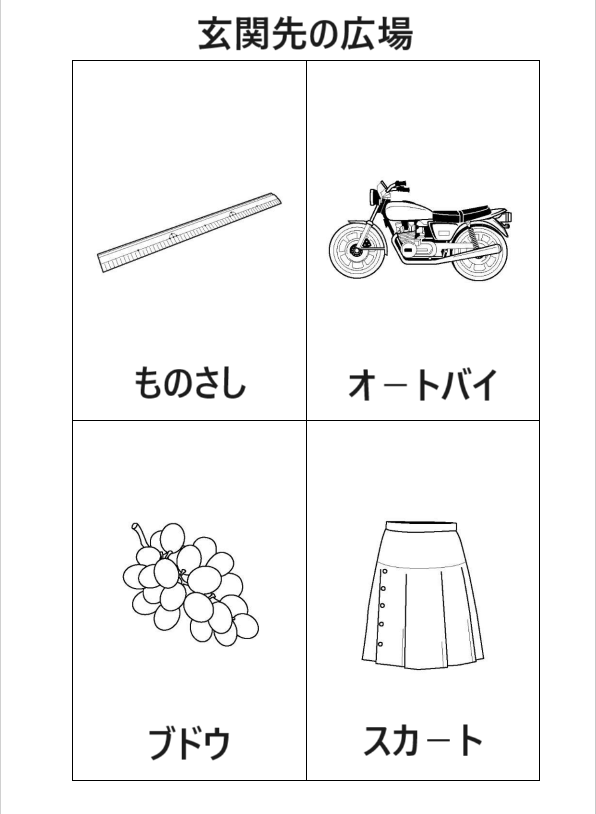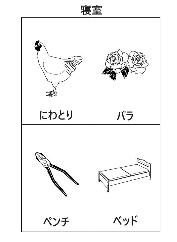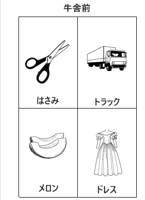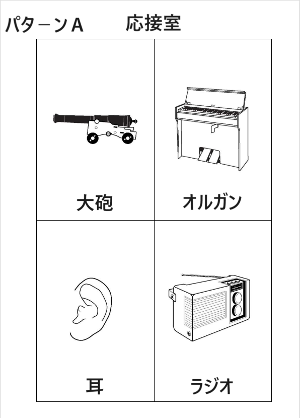 - 4パタ-ンのイラストは同一順に配置されています。1枚目が戦いの武器、楽器、体の一部、電気製品です。2枚目が昆虫、動物、野菜、台所用品です。3枚目が文房具、乗り物、果物、衣類です。4枚目が鳥、花、大工道具、家具です。これは、 手がかり回答のヒントでもあります。何度も学習していると、自然に頭に入ります。