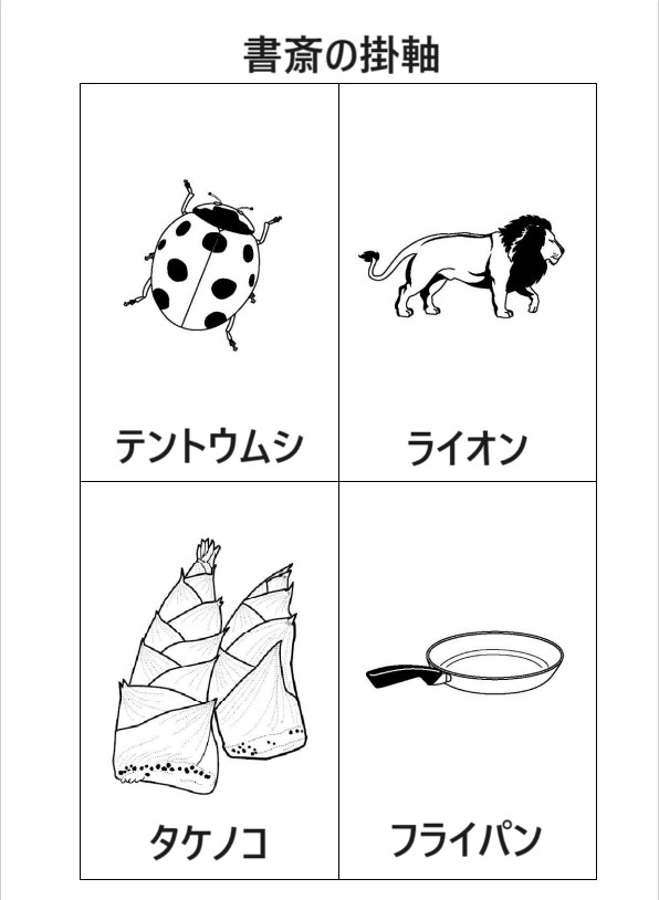 - 書斎には掛け軸があり、竹林にタケノコと、点々(てんとう虫を連想)模様のライオンが描かれている。掛軸にフライパンをぶら下げて重しとしている。